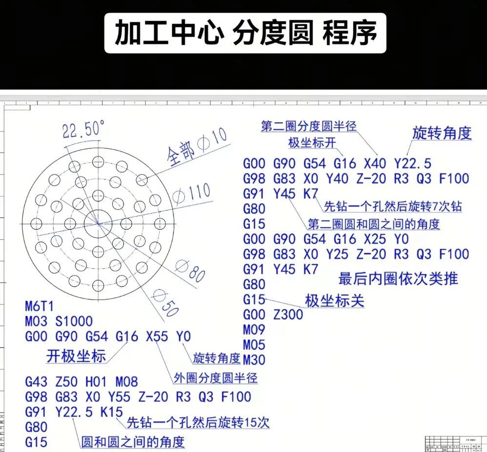 掌握 “极坐标开→分层定位→固定循环钻→极坐标关” 的逻辑,多圈等分加工可一键复制: