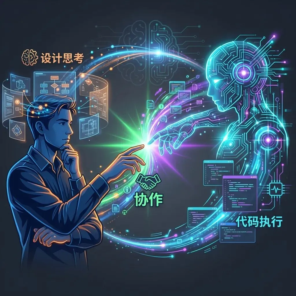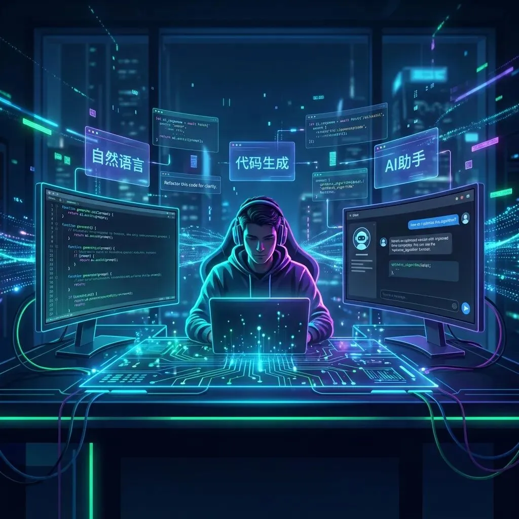 意思是你不用再一行行敲代码了。跟AI说说你想要什么效果,它替你写。语法?API细节?不用记,AI搞定。