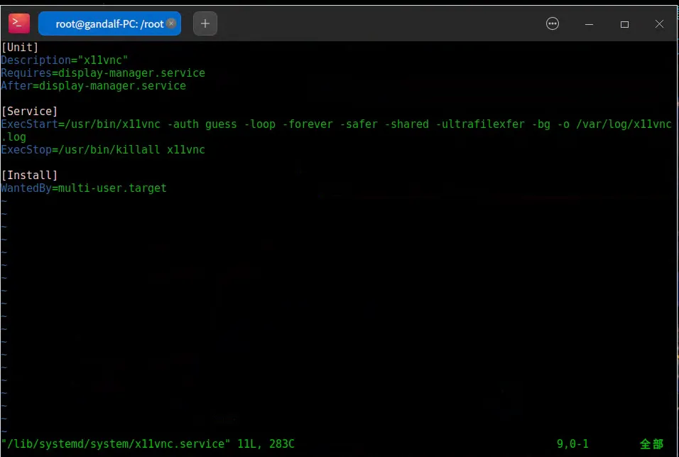 待x11vnc安装完成后,使用x11vnc -storepasswd设置vnc客户端连接密码;root@gandalf-PC:~# touch /lib/systemd/system/x11vnc.service