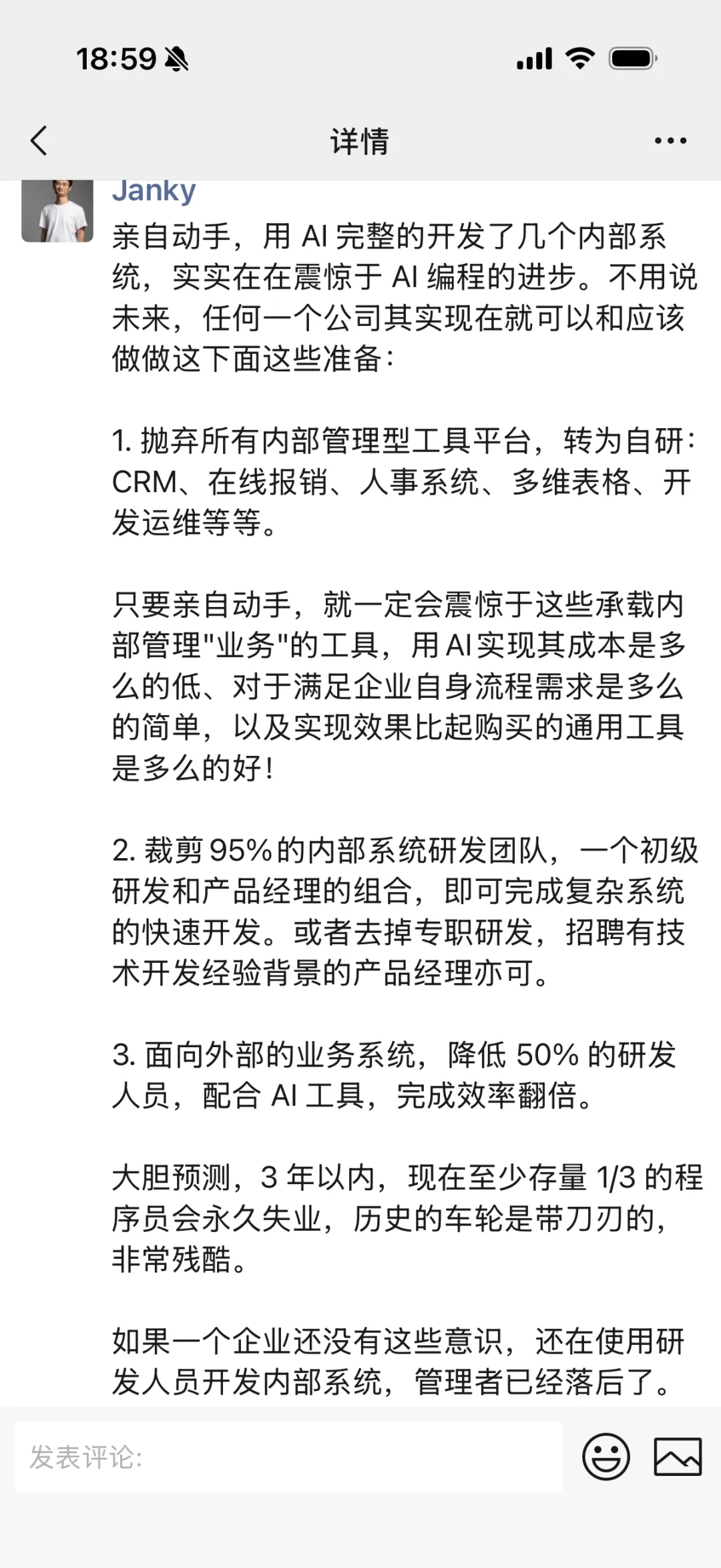 一切就绪,码上出发,我写下了第一句 Prompt:Create a project that contains both server and frontend service building on nodejs and react frameworks, use mysql as the database and material design style for user interface.在随后和同事的交流中,我比较惊奇的发现,我竟然从没有过一把梭哈的想法,直到现在也没去尝试过直接告诉 AI:“帮我构建一套 HRM 系统”。而这个习惯,我当前的认知里认为是正确的。这是我事实上的第一个系统化的 AI 工程项目,个人着实被 AI 的自动化和智能化震惊到,在我远古时期的编程记忆里,要自己定义数据库 schema、编写 CRUD、构建 API 接口、写 UI,这些最基础的编程事务占据了程序员大部分的精力,且耗时长久,而现在这些都消失在了偏产品需求的 Prompt 里,尤其是在 AI 项目的早期,无需过于调整代码结构和组织形式的时候。按过去的经验估算,要实现我的需求,写一整套前后端的系统,紧赶慢赶也要个把礼拜吧,需求听起来是挺简单的,但是也包含了一个系统需要的所有内容:用户体系、结构化数据存储和调用、非结构化数据(简历 PDF)的读写和存储、用户界面,一个礼拜都是往少了说了,而且能前后端一把梭哈的程序员早都是稀罕物件了,代码细分工之后,早就是前端是前端,后端是后端了。但是结果花了多久呢,半天不到!消耗的 Token 量也才 127 万,Gemini 免费的额度都没用完。至于系统的成熟度,不仅达到了最初凑合用的要求,更是超越了不少。因为当你发现说句话就能构建出一大块功能的时候,你是很难忍住不去发散的。于是我就有了拥有报表、简历库、招聘流程管理、ACL 权限、日志、和用户体系的小型 HRM 系统。最重要的,还是 AI 驱动的招聘管理系统,自动解析简历创建候选人、自动分析岗位匹配度。AI 辅助下取得如此完美的成果,成功唤醒了我尘封已久的编程激情,one thing led to another,如果实现企业自己的系统如此简单和快速了,那何不顺手把其他的都做了,企业邮箱、项目管理、客户管理(CRM)、成本管理、报销系统、流程管理,同时在所有环节加上 AI,提升所有人工作效率和体验。于是就有了下面一整套完整的 AI Native 系统,不仅集成了几乎一个企业办公需要的所有系统模块,还在能用 AI 的地方都用上了 AI,自动解析邮件、自动创建工单、自动回复邮件、自动解析报销发票,同时集成了主流的所有可能 AI 模型,用于辅助员工日常工作的 ChatBot。(用户首页,类似传统 OA 的首页,作为员工入口)(用户问题工单模块,依据用户反馈描述自动生成工单)(ChatBot 与整个系统数据打通,随时应答员工问题)整个系统已经上线运行,后面将根据实际内部反馈去优化、迭代,以及整合其他内部系统如运维系统、发布系统、自动化测试用例系统等等。每个企业都有自己的业务流程和独有的运作方式,因此对使用的各种信息化软件产品,都有不同的诉求,在过往大型企业拥有钞能力,选择全线自研的模式,去打通企业内所有数据和流程,以及支持自身特有的业务诉求;而其他中小企业,只能依靠外采第三方相对标准化的软件产品,或者为了自身的特殊需求支付额外的高昂定制化和交付费用。如今连我们这样的小企业,都能快速,近乎零成本的自研一整套独属于自己的一体化系统,那么任何一家企业也都可以这么做了。自研,是我曾经吐槽企业的一个核心把柄,但现在我彻底转变了想法,企业自身信息化需求,还有什么理由不自研?业务复杂度,研发成本,已经成了乙方口中最后的遮羞布和借口,AI 的效率和进化速度已经将人类捍卫的经验和知识碾碎。如果连我,一个 10 年不写代码的人,都能很快的构建起 CRM、报销、项目管理这些企业依赖的系统,那么这些厂商存在的意义还剩多少?对于软件厂商来讲,那些作为 Excel 和 BPM(流程)的衍生的产品,在这一轮的 AI 浪潮下,已经被判了死刑,其剩余的生命时长,仅取决于甲方对于 AI 的拥抱决心,当然了这个过程也会要很多年。每个乙方都必须要在 AI 的“阴霾”下,找到出路和长远发展的机会。假设要让一个一线的程序员来复刻我这一套系统,他大概需要多久?原因是实现这一套系统的并不仅仅是 AI,还需要一个程序员、一个产品经理、一个销售、一个售前、一个客户、一个财务、一个 HR、一个老板,而碰巧这所有的不同角色,都集中在了我的身上,我才能在写出的每一个 Prompt 里包含了产品设计、业务流程、代码结构的要求,还捎带一点处女座的审美。这就是我对程序员这一群体和角色的建议和忠告,AI 对于能力综合者,是个强有力的助手,而对于短视和险隘者,却是一把要命的利刃。普通人,即非研发背景的大众,是否可以依赖 AI 编程去开发系统和工具?我的答案是,几乎不可能。任何沉醉于社交媒体的习惯,都是不建议的。随着系统复杂度的提升,会越来越需要程序员的专业能力,去排错、调试和指导 AI 编写代码,没有专业的研发背景越到后面越是寸步难行。