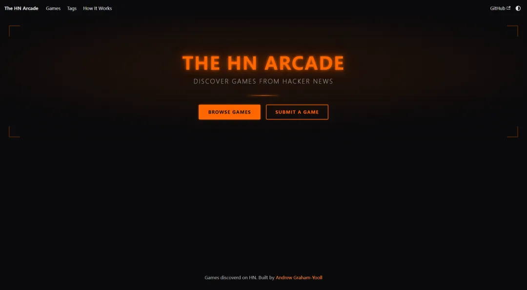 整体设计简约现代,橙黑配色方案突出科技感,符合HN用户偏好。用户可通过“Browse games”探索热门作品,或直接提交原创游戏,促进开源游戏生态发展。该项目作为Show HN展示,体现了开发者对社区互动的创新尝试。(218字)
