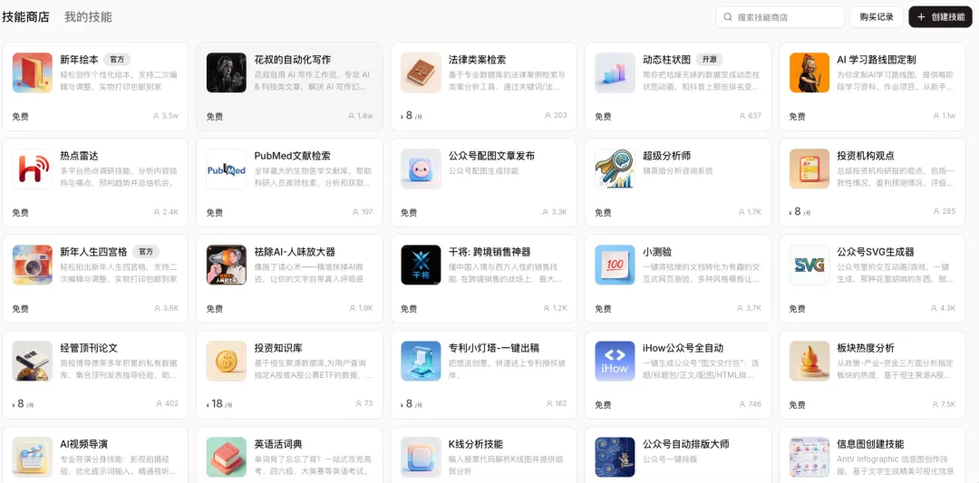 不用写代码!Coze Skills+技能商店,普通人的AI副业新风口✨哈喽,各位想靠AI搞副业的伙伴们,我是你们深耕AI副业赛道的博主——AI副业觉醒。这段时间后台总有人问我:“想做AI副业,却不会编程、不会调教AI,有没有零门槛的切入点?”“试过很多AI工具,要么功能太复杂,要么赚不到钱,到底该选什么?”今天不绕弯子,直接给大家上硬菜——字节跳动旗下Coze(扣子)推出的Coze Skills+技能商店,堪称普通人的AI副业神器。先跟大家说句实在的:2026年的AI副业,拼的不是“会用多少工具”,而是“会不会借力工具,把重复劳动变成被动收入”。不用写一行代码,不用有专业AI知识,哪怕是纯新手,也能靠它快速上手,要么省时间高效接单,要么把自己的经验变成“数字资产”赚钱,完美契合咱们“用AI轻量化搞副业”的核心需求。先用大白话讲清楚,这两个东西到底是什么,新手也能一秒听懂。 而Coze Skills和技能商店,刚好解决了普通人做AI副业的两大痛点:不会做、赚不到。✅ Coze Skills:预制好的“AI能力包”说白了就是别人已经把“做事流程、风格模板、知识库”都封装好的AI工具,你不用从零调教,一键调用,就能让AI帮你完成具体任务——比如写公众号文案、做PPT、整理会议纪要,甚至生成小红书爆款脚本。以前用AI写文案,你得反复说“要小红书调性、要口语化、要带痛点”,反复调试;而用Coze Skills,直接调用“小红书爆款文案技能”,输入产品名称和卖点,10秒就能出一篇合格文案,省去80%的时间,这不就是咱们搞副业最需要的效率吗?- 里面摆满了各行各业的现成Coze Skills,有免费的,也有付费的,覆盖4大类高频副业场景,新手直接拿来用就好,不用自己费心创建。