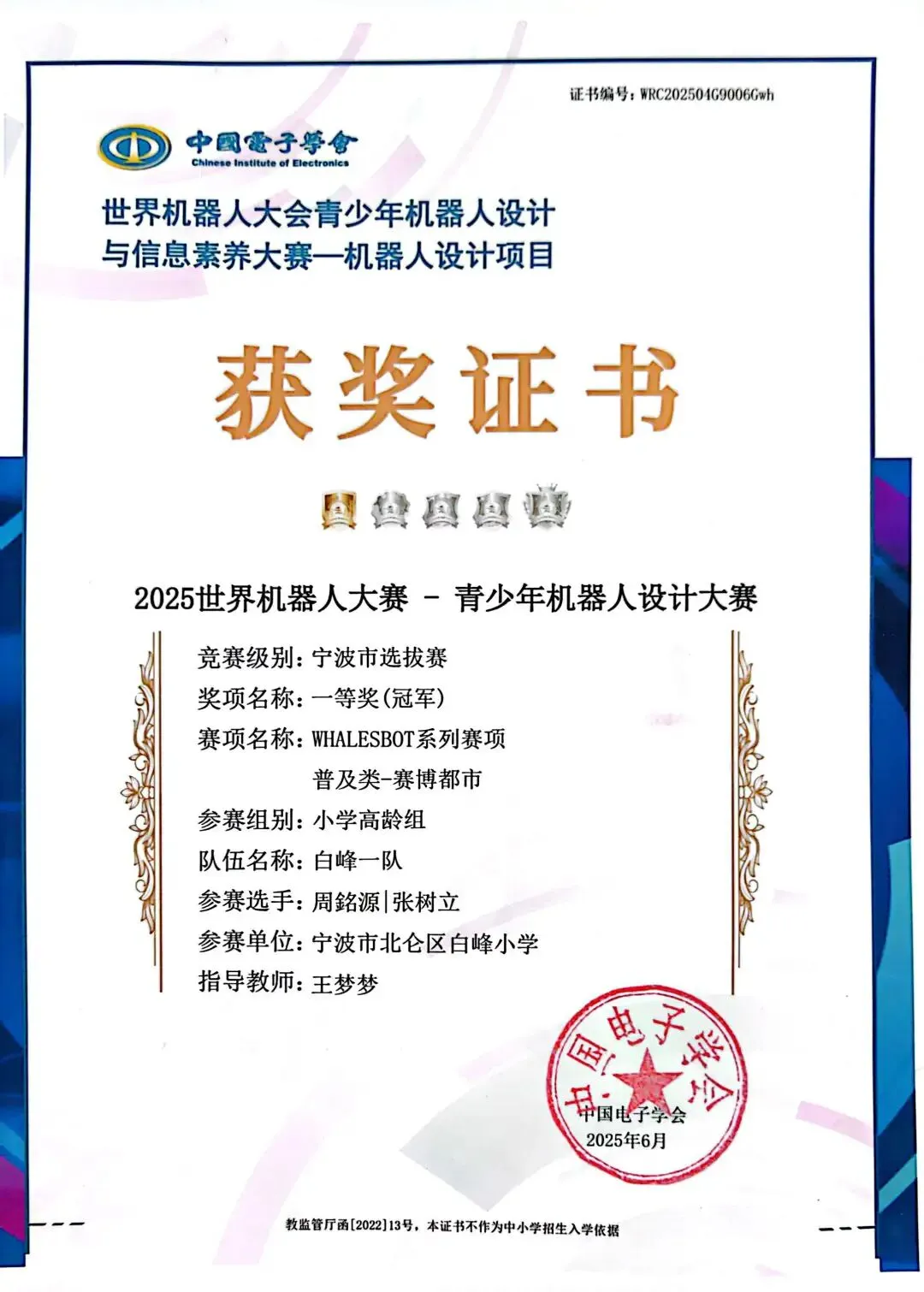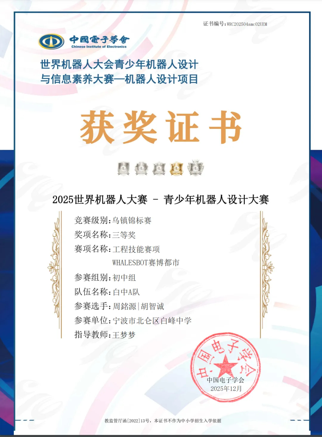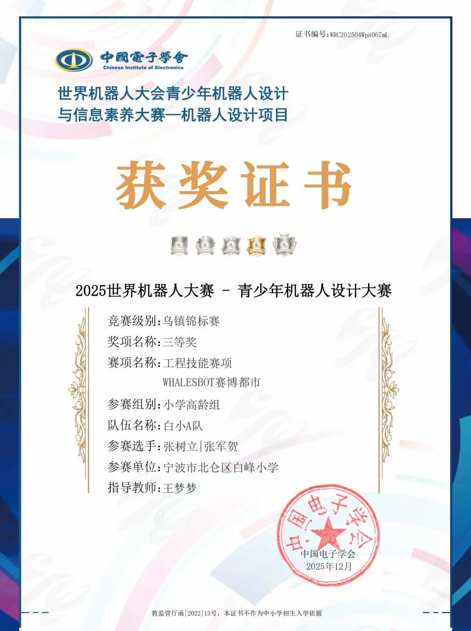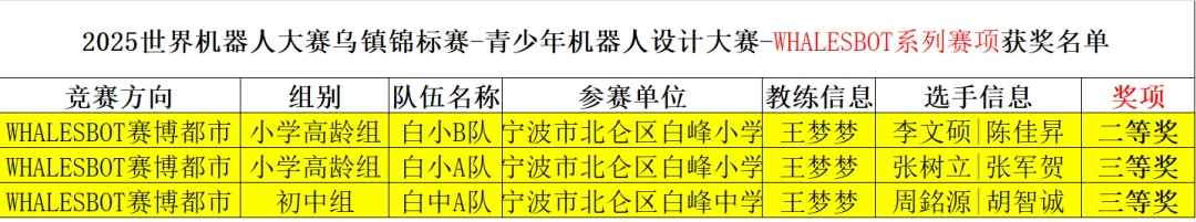 近期,根据公布的赛事结果,我校6名队员参加的WHALESBOT系列赛博都市赛项均获佳绩。