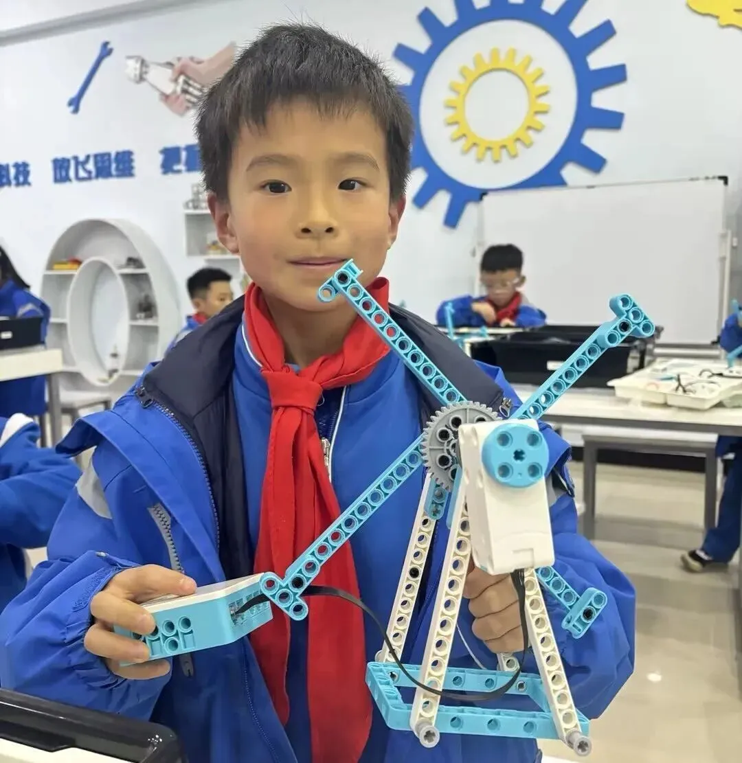 在社团课堂上,孩子们化身小小工程师,从认识天枢套装的各类零件开始,一步步解锁搭建的奥秘。大家对照着图纸,将齿轮、连杆、电机等零件精准组合,从简单的机械臂、小车框架,到能完成特定动作的机器人模型,每一次拼接都凝聚着思考与尝试。