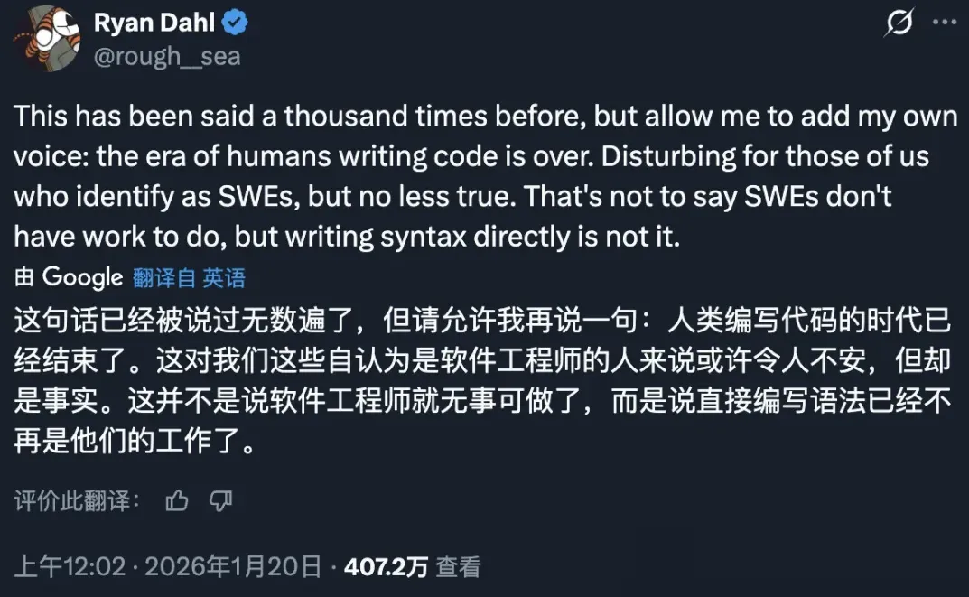 Node.js 创始人 Ryan Dahl 在 X 平台扔下了一枚“炸弹”。他在推文中直言:“人类手写代码的时代已经结束。” 这句话迅速引爆了全球开发者社区的讨论,一天之内获得了超过 400 万次的阅读。