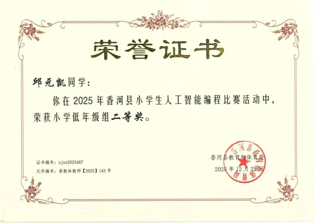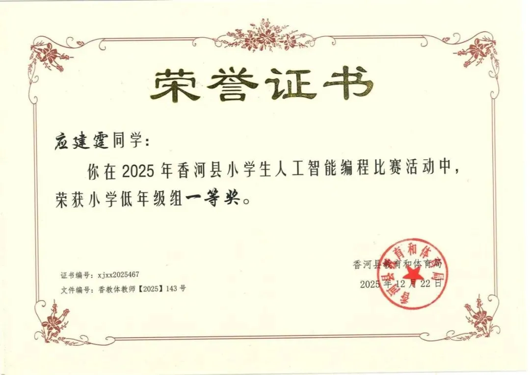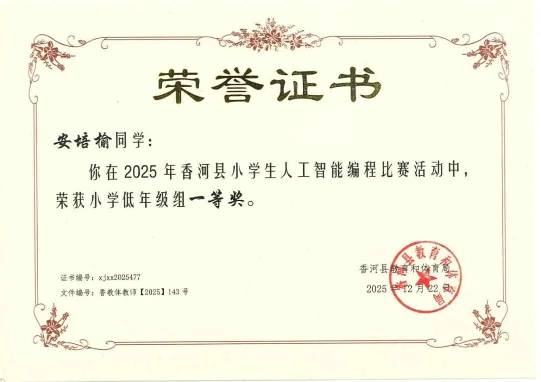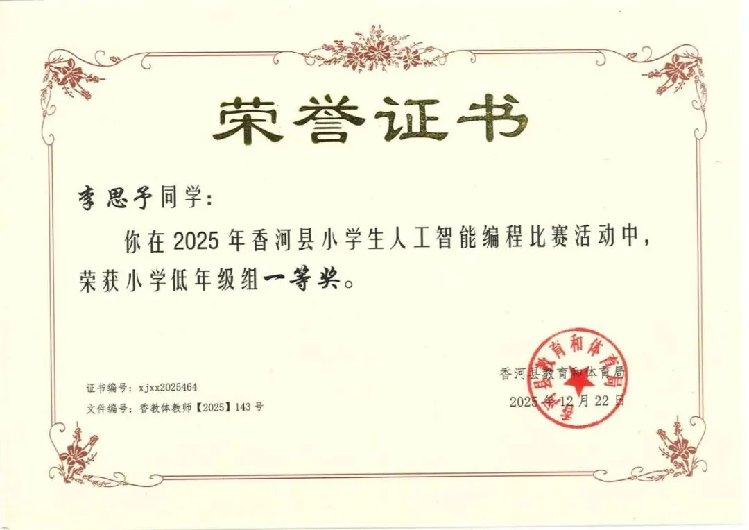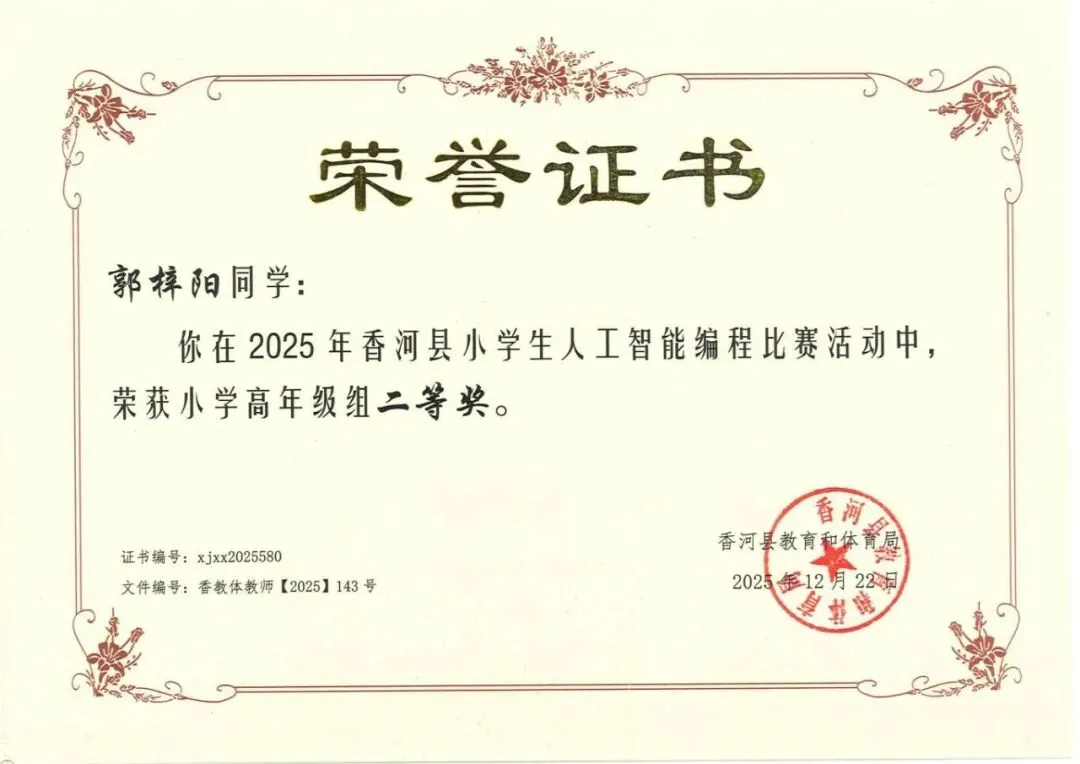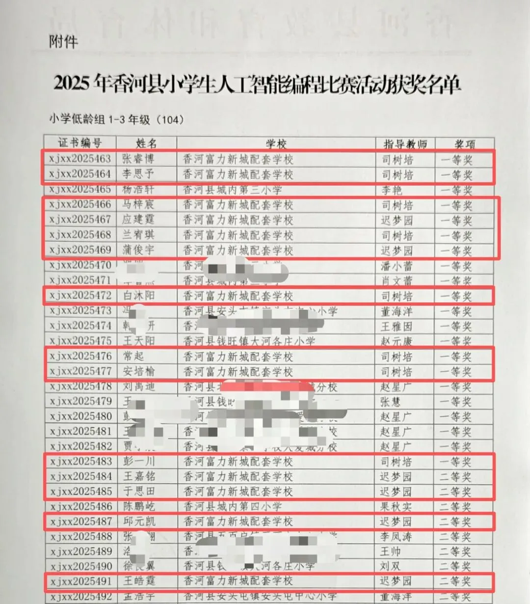 科技赋能成长,编程点亮未来!近日,在香河县教育局和体育局举办的2025年香河县小学生人工智能编程比赛中,我校学子凭借扎实的编程功底、卓越的创新思维交出了一份亮眼答卷——23名参赛同学全员获奖,斩获11项一等奖,8项二等奖、4项三等奖,获奖率100%!