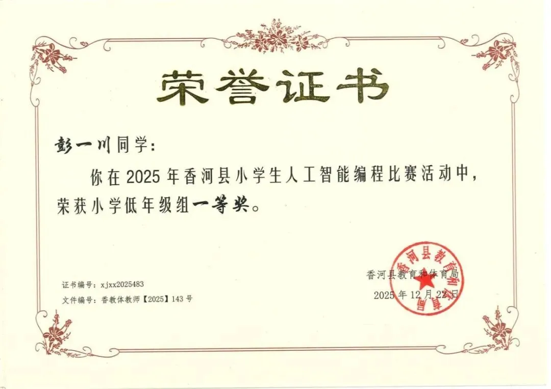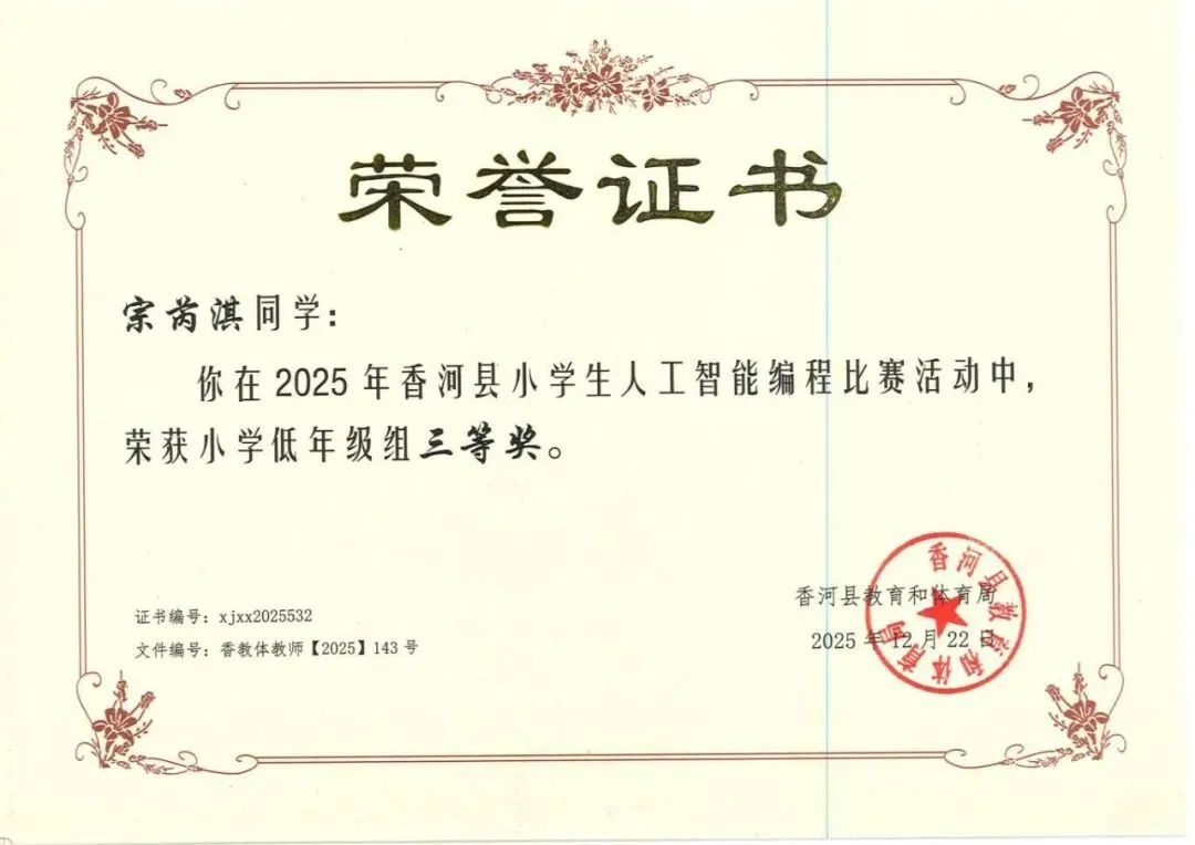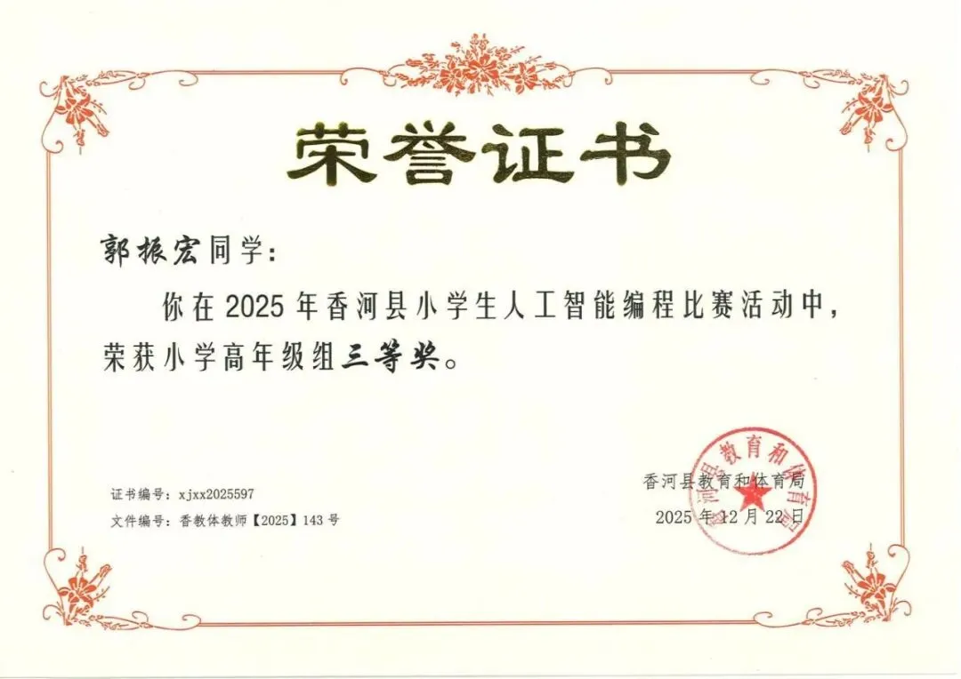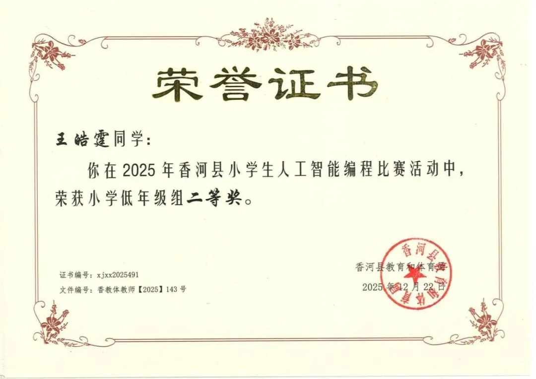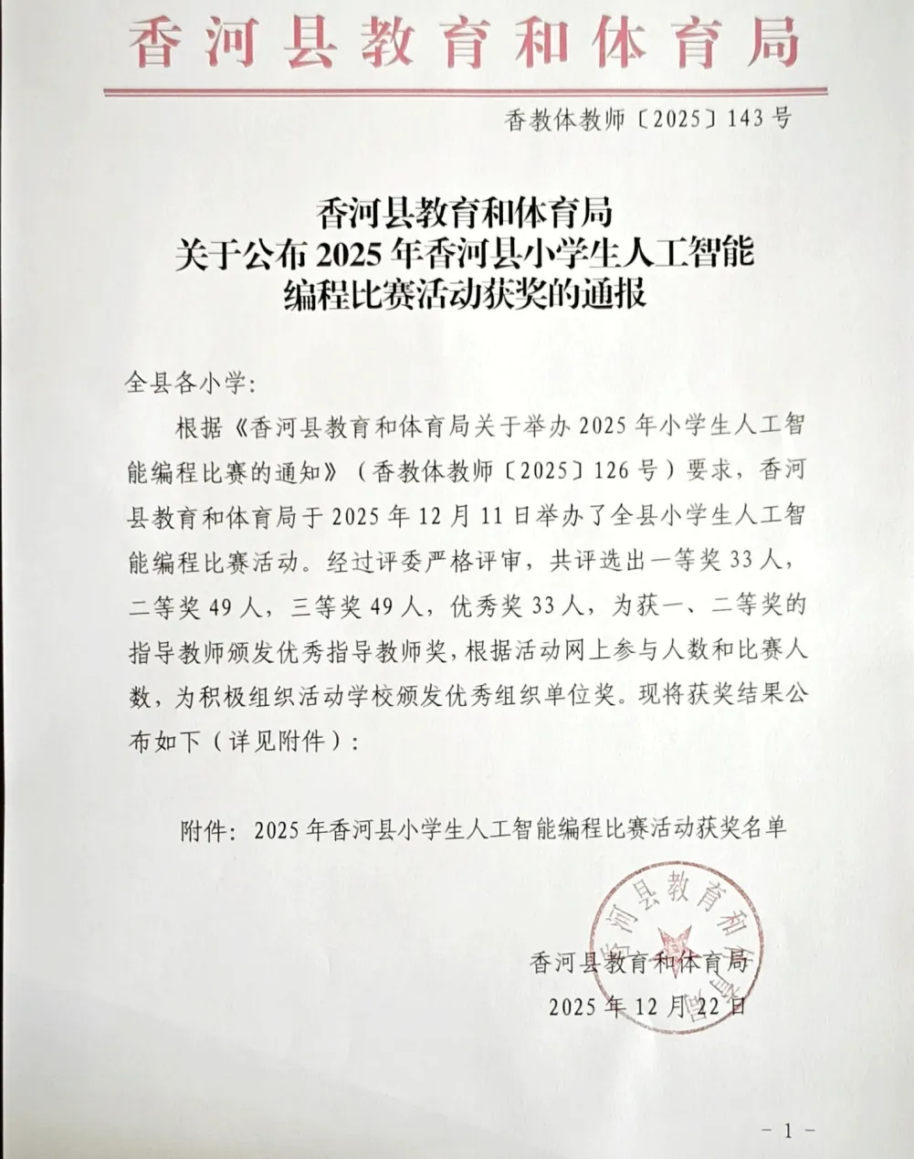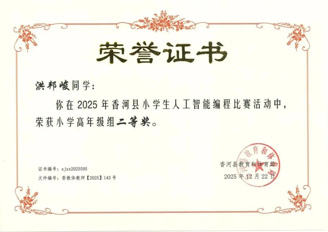 科技赋能成长,编程点亮未来!近日,在香河县教育局和体育局举办的2025年香河县小学生人工智能编程比赛中,我校学子凭借扎实的编程功底、卓越的创新思维交出了一份亮眼答卷——23名参赛同学全员获奖,斩获11项一等奖,8项二等奖、4项三等奖,获奖率100%!