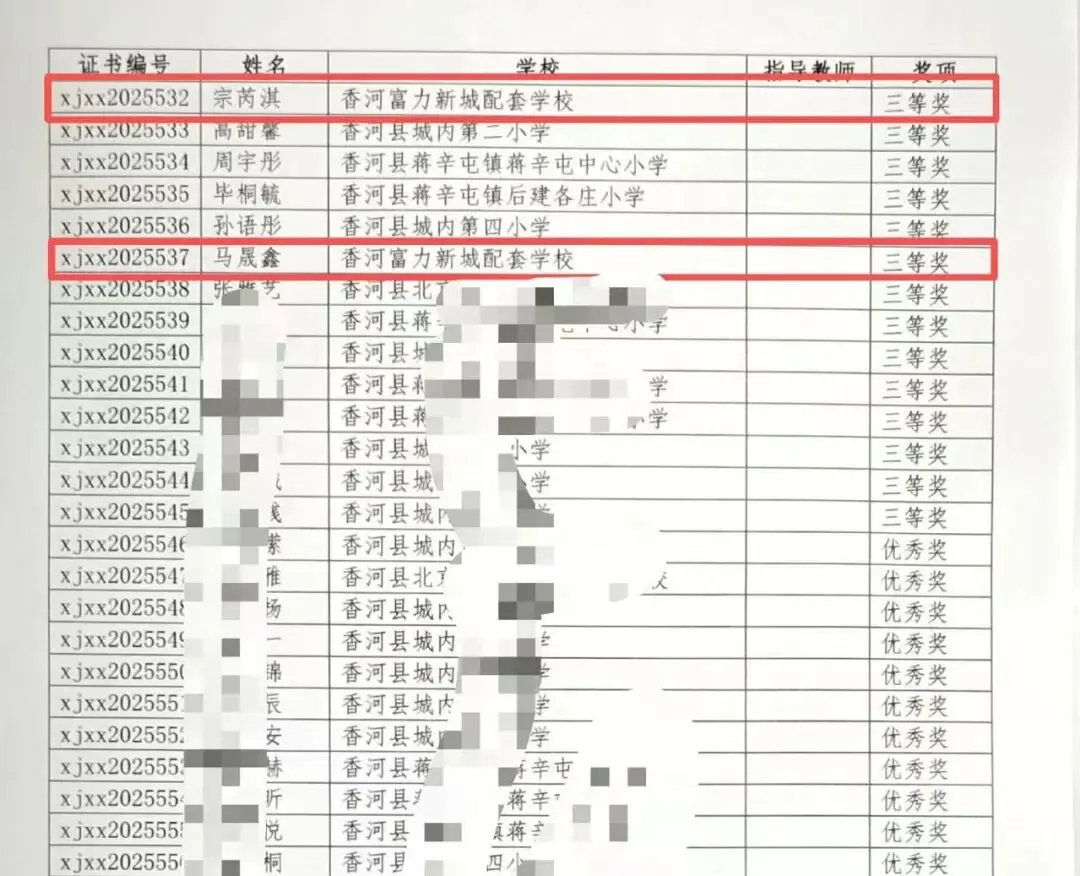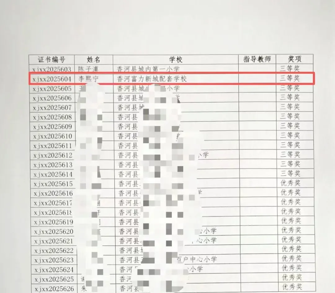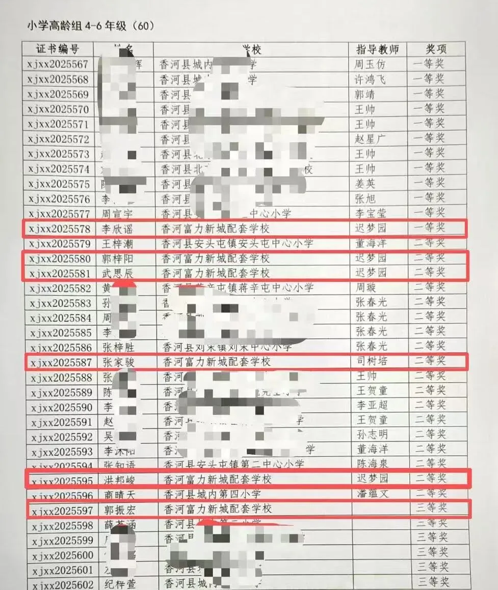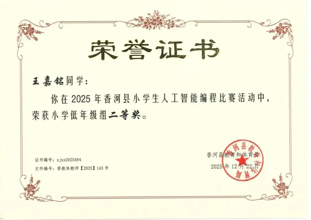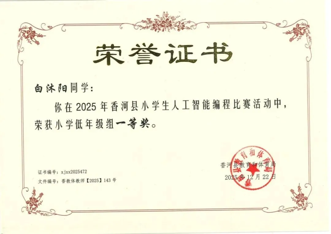 科技赋能成长,编程点亮未来!近日,在香河县教育局和体育局举办的2025年香河县小学生人工智能编程比赛中,我校学子凭借扎实的编程功底、卓越的创新思维交出了一份亮眼答卷——23名参赛同学全员获奖,斩获11项一等奖,8项二等奖、4项三等奖,获奖率100%!