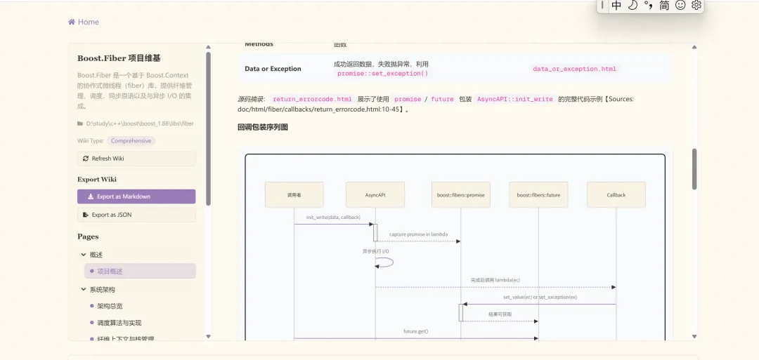 大功告成,可以使用deepwiki-open分析代码、编写文档了。我使用它生成了我正在做的RUST项目的结构文档,同事居然说比我写的清楚、明白、丰富多了,汗颜啊。当然,最爱还是C++,我也是使用deepwiki-open写了booost的Fiber的总结介绍,截图如下,效果也是非常棒的。 AI不应该代替程序员,而应该助力程序员做出更有创意、更优秀的产品。