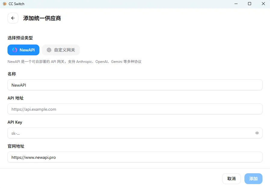 添加供应商:点击“添加供应商”,选择预设模板或自定义,填入必要信息(如API Key和基础URL)。
