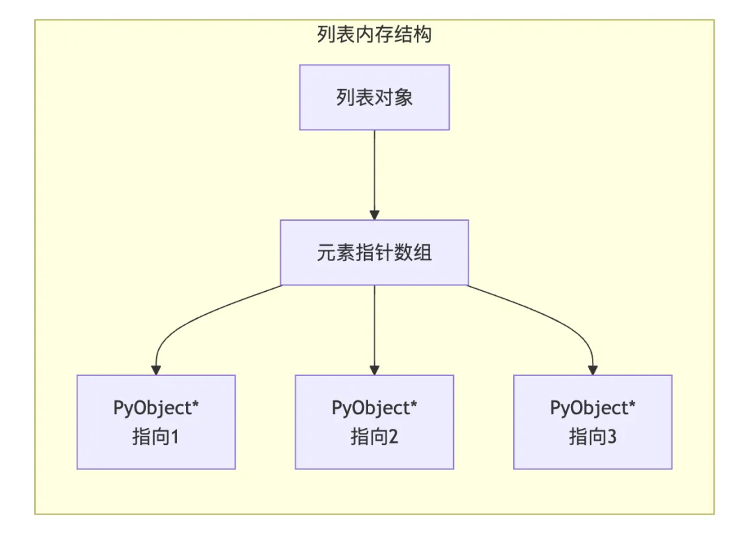 列表在Python中是一个动态数组,元素存储在连续的内存空间中: