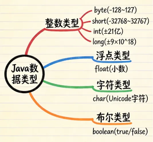 - 8种基本数据类型各有所长:整数类型(byte/short/int/long)、浮点类型(float/double)、字符类型(char)、布尔类型(boolean)