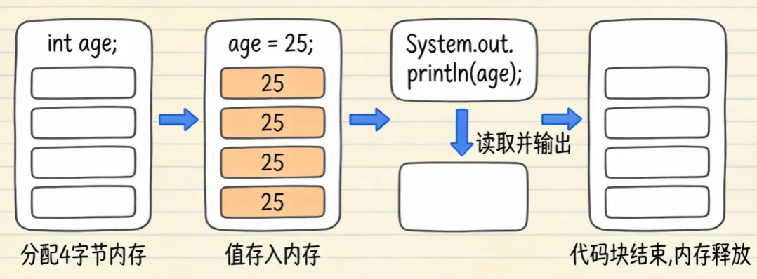 age = 25; → 将值25存入分配的内存空间 - 使用阶段: