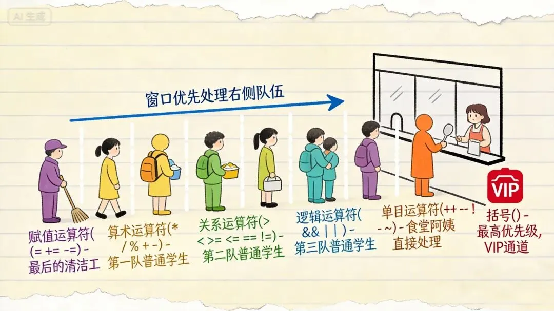 - 运算符是数据处理的工具:算术运算符(+ - * / %)、关系运算符(> < == !=)、逻辑运算符(&& || !)、赋值运算符(= += -=等)