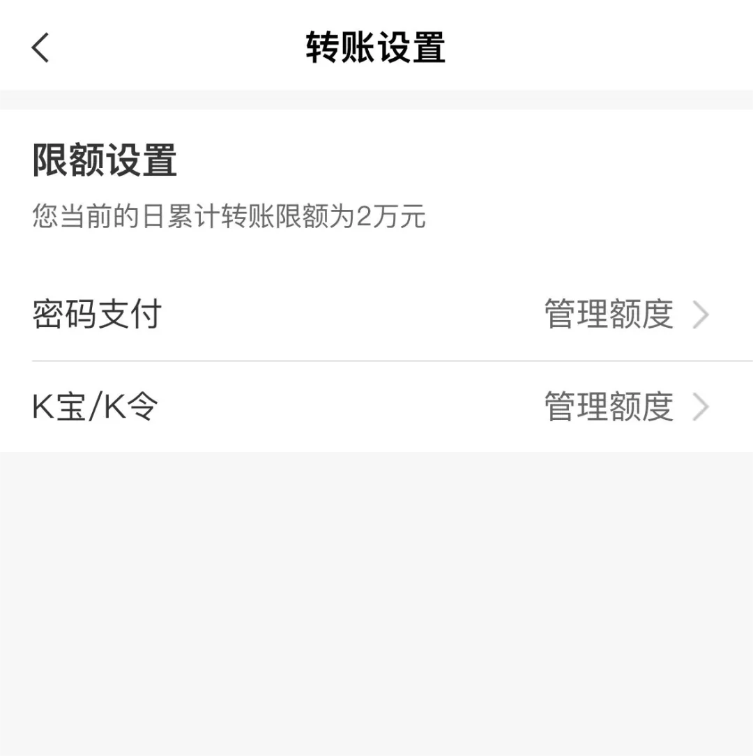 农行APP--右下角我的--安全中心--支付设置--限额设置--k宝--管理限额.