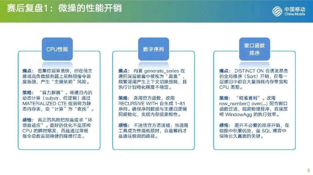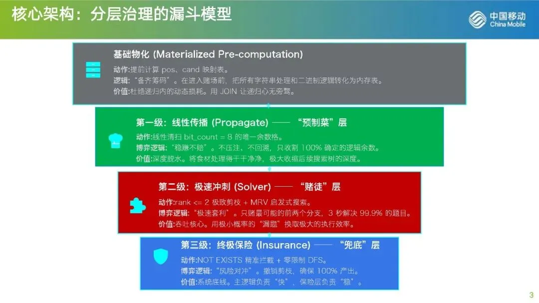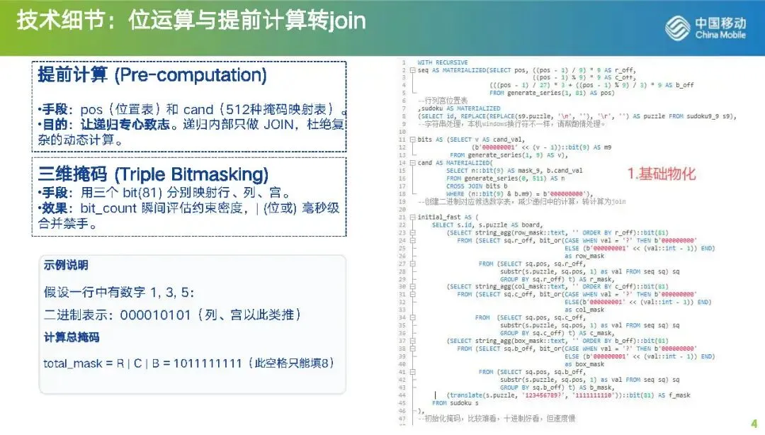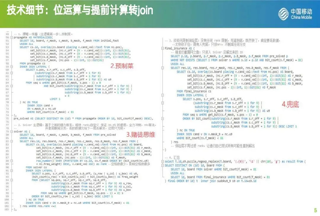WITH RECURSIVEseq AS MATERIALIZED(SELECT pos, ((pos - 1) / 9) * 9 AS r_off, ((pos - 1) % 9) * 9 AS c_off, (((pos - 1) / 27) * 3 + ((pos - 1) % 9) / 3) * 9 AS b_off FROM generate_series(1, 81) AS pos),--行列宫位置表sudoku AS MATERIALIZED(SELECT id, REPLACE(REPLACE(s9.puzzle, '\n', ''), '\r', '') AS puzzle FROM sudoku9_9 s9),--字符串处理,本机windows换行符不一样,请帮酌情处理。bits AS (SELECT v AS cand_val, (b'000000001' << (v - 1))::bit(9) AS m9 FROM generate_series(1, 9) AS v),cand AS MATERIALIZED(SELECT n::bit(9) AS mask_9, b.cand_val FROM generate_series(0, 511) AS n CROSS JOIN bits b WHERE (n::bit(9) & b.m9) = b'000000000'),--创建二进制对应候选数字表,减少递归中的计算,转计算为joininitial_fast AS (SELECT s.id, s.puzzle AS board,(SELECT string_agg(row_mask::text, '' ORDER BY r_off)::bit(81) FROM (SELECT sq.r_off, bit_or(CASE WHEN val = '?' THEN b'000000000' ELSE (b'000000001' << (val::int - 1)) END) as row_mask FROM (SELECT sq.pos, sq.r_off, substr(s.puzzle, sq.pos, 1) as val FROM seq sq) sq GROUP BY sq.r_off) t) AS r_mask,(SELECT string_agg(col_mask::text, '' ORDER BY c_off)::bit(81) FROM (SELECT sq.c_off, bit_or(CASE WHEN val = '?' THEN b'000000000' ELSE (b'000000001' << (val::int - 1)) END) as col_mask FROM (SELECT sq.pos, sq.c_off, substr(s.puzzle, sq.pos, 1) as val FROM seq sq) sq GROUP BY sq.c_off) t) AS c_mask,(SELECT string_agg(box_mask::text, '' ORDER BY b_off)::bit(81) FROM (SELECT sq.b_off, bit_or(CASE WHEN val = '?' THEN b'000000000' ELSE (b'000000001' << (val::int - 1)) END) as box_mask FROM (SELECT sq.pos, sq.b_off, substr(s.puzzle, sq.pos, 1) as val FROM seq sq) sq GROUP BY sq.b_off) t) AS b_mask,(translate(s.puzzle, '123456789?', '1111111110'))::bit(81) AS f_maskFROM sudoku s),--初始化掩码,比较难看,十进制好看,但速度慢-- 1. 裸唯一传播 (主逻辑第一步),预制菜。propagate AS MATERIALIZED(SELECT id, board, r_mask, c_mask, b_mask, f_mask FROM initial_fastUNION ALLSELECT cs.id, overlay(cs.board placing v.cand_val::text from nc.pos),set_bit(cs.r_mask, (nc.r_off + (9 - v.cand_val))::int, 1)::bit(81),set_bit(cs.c_mask, (nc.c_off + (9 - v.cand_val))::int, 1)::bit(81),set_bit(cs.b_mask, (nc.b_off + (9 - v.cand_val))::int, 1)::bit(81),set_bit(cs.f_mask, (nc.pos - 1)::int, 1)::bit(81)FROM propagate csINNER JOIN LATERAL (SELECT s.pos, s.r_off, s.c_off, s.b_off, (substring(cs.r_mask from s.r_off + 1 for 9) | substring(cs.c_mask from s.c_off + 1 for 9) | substring(cs.b_mask from s.b_off + 1 for 9)) AS u9FROM seq s WHERE get_bit(cs.f_mask, s.pos - 1) = 0AND bit_count(substring(cs.r_mask from s.r_off + 1 for 9) | substring(cs.c_mask from s.c_off + 1 for 9) | substring(cs.b_mask from s.b_off + 1 for 9)) = 8 LIMIT 1) nc ON TRUE INNER JOIN cand v ON v.mask_9 = nc.u9 WHERE bit_count(cs.f_mask) < 81),pre_solved AS (SELECT DISTINCT ON (id) * FROM propagate ORDER BY id, bit_count(f_mask) DESC),-- 2. Solver 主逻辑:基于之前的强力版本,维持 rank=自定义 保证 99.9% 的速度,全力冲刺,MRV算法,并激进删减分支,丢的数据交给下一层去解决,这层只为快。solver AS (SELECT id, board, r_mask, c_mask, b_mask, f_mask FROM pre_solvedUNION ALLSELECT res.id, res.board, res.r_mask, res.c_mask, res.b_mask, res.f_mask FROM (SELECT cs.id, overlay(cs.board placing v.cand_val::text from nc.pos) AS board,set_bit(cs.r_mask, (nc.r_off + (9 - v.cand_val))::int, 1)::bit(81) AS r_mask,set_bit(cs.c_mask, (nc.c_off + (9 - v.cand_val))::int, 1)::bit(81) AS c_mask,set_bit(cs.b_mask, (nc.b_off + (9 - v.cand_val))::int, 1)::bit(81) AS b_mask,set_bit(cs.f_mask, (nc.pos - 1)::int, 1)::bit(81) AS f_mask,row_number() OVER (PARTITION BY cs.id, cs.f_mask ORDER BY (bit_count(nc.u9) + nc.freq_weight) DESC, v.cand_val ASC) as rankFROM solver csINNER JOIN LATERAL (SELECT s.pos, s.r_off, s.c_off, s.b_off, (u_row | u_col | u_box) AS u9, (bit_count(u_row) + bit_count(u_col) + bit_count(u_box)) AS freq_weightFROM (SELECT sq.pos, sq.r_off, sq.c_off, sq.b_off, substring(cs.r_mask from sq.r_off + 1 for 9) AS u_row, substring(cs.c_mask from sq.c_off + 1 for 9) AS u_col, substring(cs.b_mask from sq.b_off + 1 for 9) AS u_box FROM seq sq WHERE get_bit(cs.f_mask, sq.pos - 1) = 0) sORDER BY bit_count(u_row | u_col | u_box) DESC LIMIT 1) nc ON TRUEINNER JOIN cand v ON v.mask_9 = nc.u9 WHERE bit_count(cs.f_mask) < 81) res WHERE res.rank <=2),-- 3. 终极无限制保险层:没有任何 rank 限制,死磕到底,既然快了,肯定要丢数据,太快收不住,得有人兜底,只按mrv,不删减任何分支final_insurance AS (-- 精准拦截漏网之鱼:只进入 Solver 没解出来的 IDSELECT p.id, p.board, p.r_mask, p.c_mask, p.b_mask, p.f_mask FROM pre_solved pWHERE NOT EXISTS (SELECT 1 FROM solver s WHERE s.id = p.id AND bit_count(s.f_mask) = 81)UNION ALLSELECT res.id, res.board, res.r_mask, res.c_mask, res.b_mask, res.f_mask FROM (SELECT cs.id, overlay(cs.board placing v.cand_val::text from nc.pos) AS board,set_bit(cs.r_mask, (nc.r_off + (9 - v.cand_val))::int, 1)::bit(81) AS r_mask,set_bit(cs.c_mask, (nc.c_off + (9 - v.cand_val))::int, 1)::bit(81) AS c_mask,set_bit(cs.b_mask, (nc.b_off + (9 - v.cand_val))::int, 1)::bit(81) AS b_mask,set_bit(cs.f_mask, (nc.pos - 1)::int, 1)::bit(81) AS f_maskFROM final_insurance csINNER JOIN LATERAL (SELECT s.pos, s.r_off, s.c_off, s.b_off,(substring(cs.r_mask from s.r_off + 1 for 9) |substring(cs.c_mask from s.c_off + 1 for 9) |substring(cs.b_mask from s.b_off + 1 for 9)) AS u9FROM seq s WHERE get_bit(cs.f_mask, s.pos - 1) = 0ORDER BY bit_count(substring(cs.r_mask from s.r_off + 1 for 9) |substring(cs.c_mask from s.c_off + 1 for 9) |substring(cs.b_mask from s.b_off + 1 for 9)) DESC LIMIT 1) nc ON TRUEINNER JOIN cand v ON v.mask_9 = nc.u9WHERE bit_count(cs.f_mask) < 81) res-- 保险层不再过滤 rank,让递归自己尝试所有可能性直到解出)-- 4. 汇总select t.id,s9.puzzle,regexp_replace(t.board, '(.{9})', '\1' || chr(10), 'g') as result from (SELECT DISTINCT ON (id) id, board FROM (SELECT i