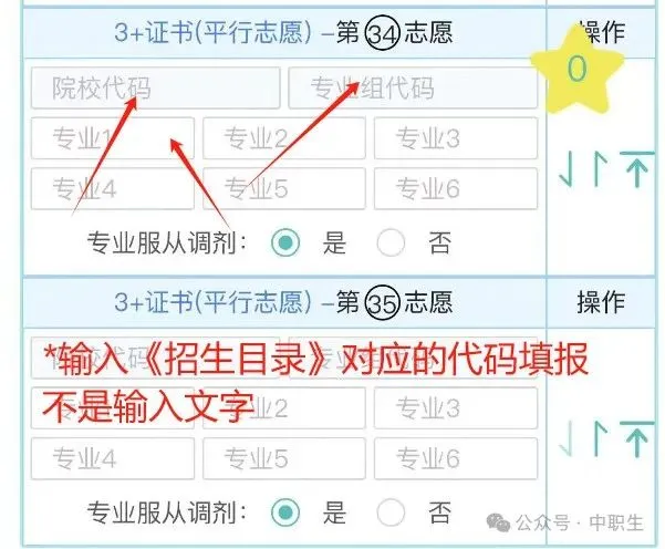 中职生批次设35个院校专业组志愿,每个院校专业组志愿设置6个专业志愿和1个是否服从专业调剂选项。