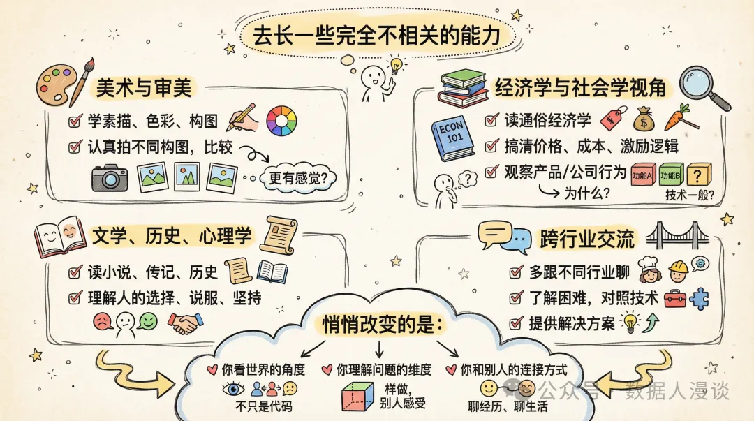 某种意义上,这些非技术的东西,会让你变得更像一个完整的人, 而不是只在特定场景里被调用的"技术函数"。