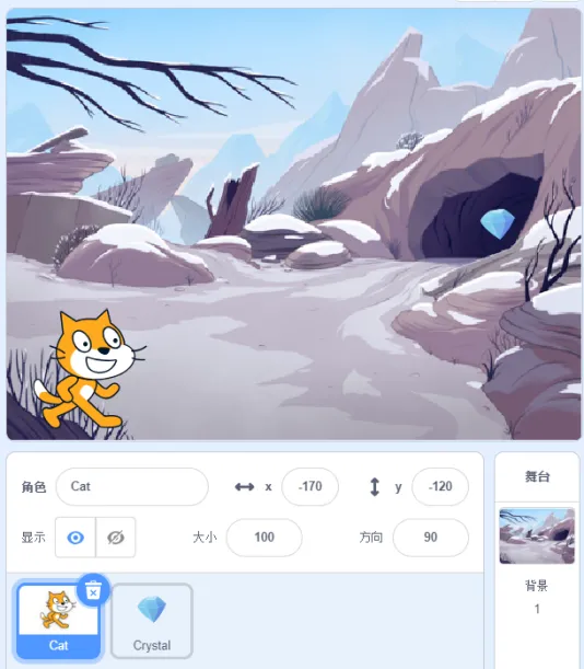 保留默认小猫角色,添加角色Crystal。