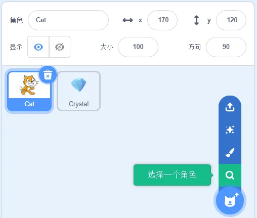 (1)保留默认小猫角色,添加角色Crystal。