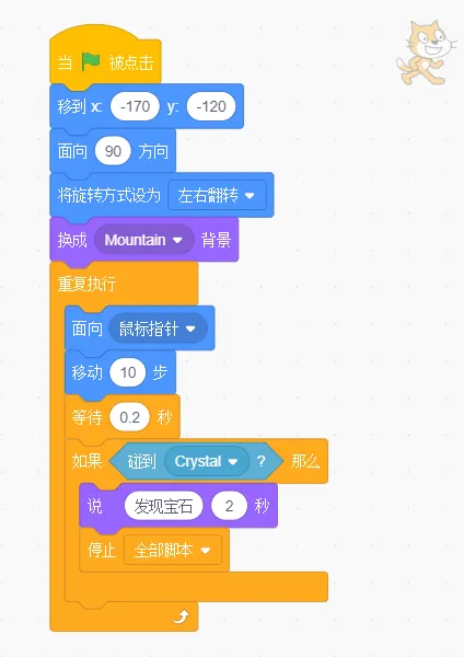 (4)在移动过程中,小猫如果找到Crystal,说“发现宝石”2秒,停止全部脚本。