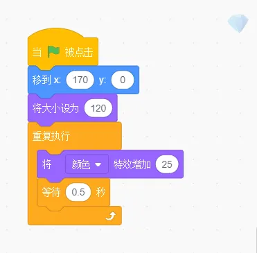 (2)点击绿旗,Crystal角色的初始位置为(X=170,Y=0),初始大小为120,Crystal角色每隔0.5秒钟颜色特效增加25。