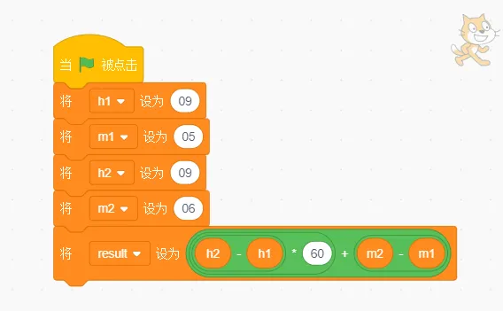 新建变量“result”,用于存储得到的结果。即两个时刻之间有多少分钟。上面的例子09时05分到09时06分,之间有1分钟,所以 result = 1。