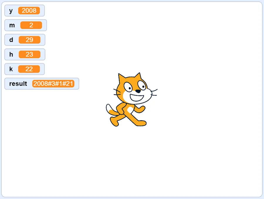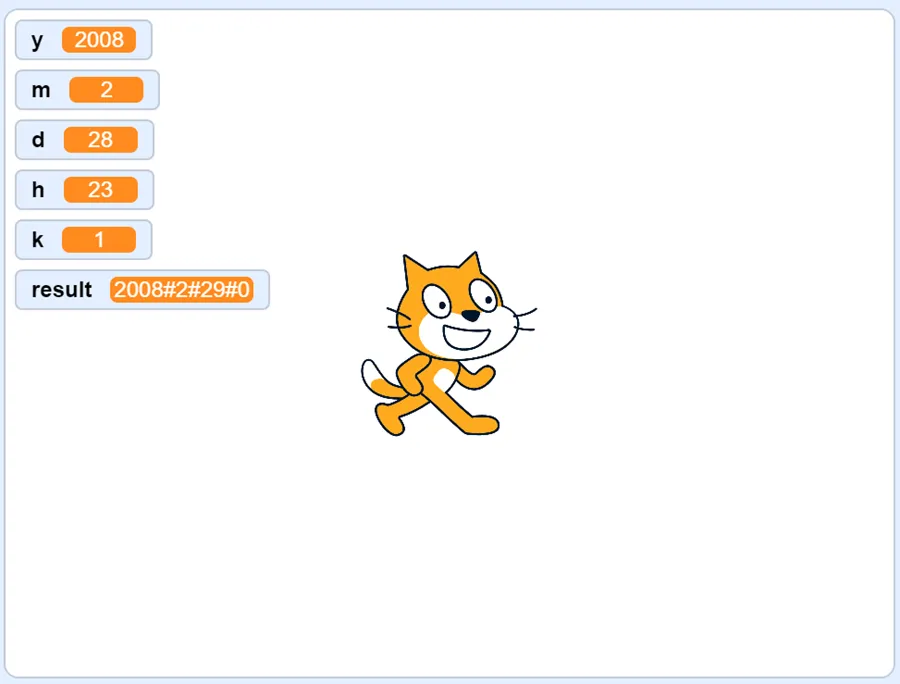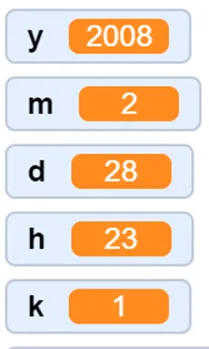 y = 2008, m = 2, d = 29, h = 23, k = 22【输出样例】
