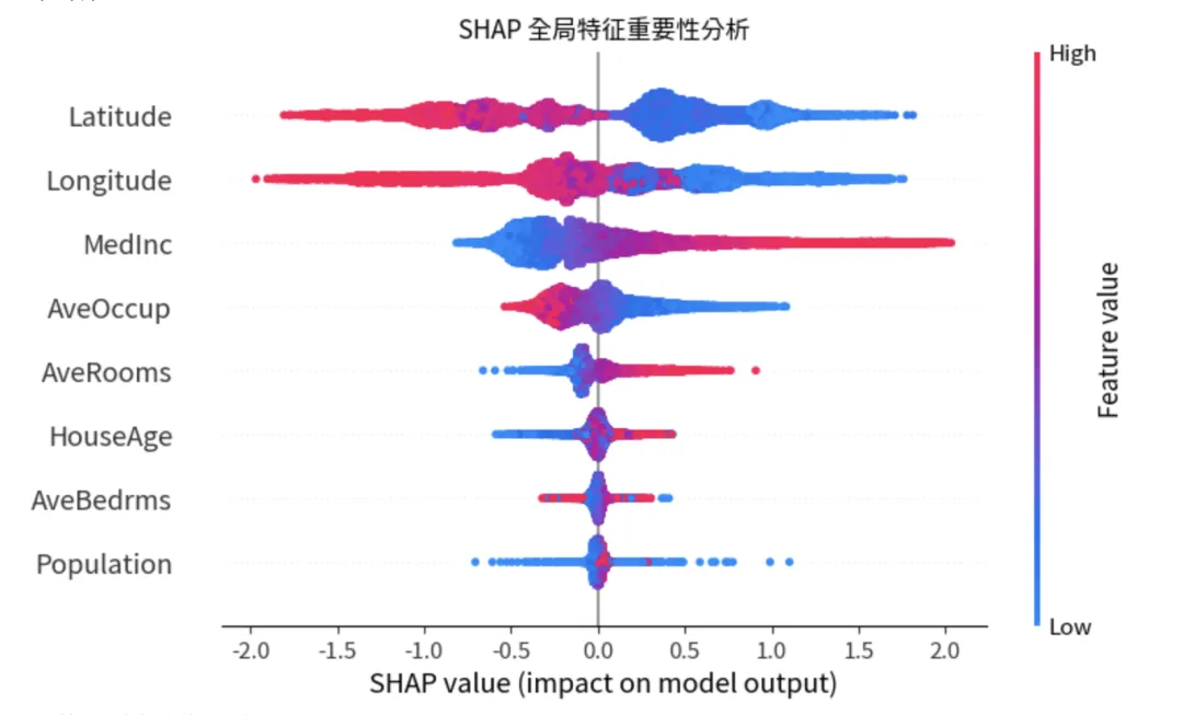 import pandas as pdimport numpy as npimport shapimport matplotlib.pyplot as pltfrom catboost import CatBoostRegressorfrom sklearn.model_selection import KFold, GridSearchCVfrom sklearn.datasets import fetch_california_housingfrom sklearn.metrics import mean_squared_error, r2_score# 1. 加载数据集 (以加州房价回归问题为例)data = fetch_california_housing()X = pd.DataFrame(data.data, columns=data.feature_names)y = data.targetprint(f"数据集大小: {X.shape}")# 2. 定义 K折交叉验证与参数优化# 我们使用 GridSearchCV 配合 K-Fold 来寻找最佳超参数kf = KFold(n_splits=5, shuffle=True, random_state=42)# 定义待优化的参数网格param_grid = {'iterations': [500],'learning_rate': [0.05, 0.1],'depth': [4, 6],'l2_leaf_reg': [1, 3],'loss_function': ['RMSE'],'verbose': [False]}# 初始化 CatBoost 回归模型cb_model = CatBoostRegressor(allow_writing_files=False)# 3. 执行参数优化print("正在进行 K折交叉验证参数优化...")grid_search = GridSearchCV(estimator=cb_model, param_grid=param_grid, cv=kf, scoring='neg_mean_squared_error', n_jobs=-1)grid_search.fit(X, y)# 输出最佳参数best_model = grid_search.best_estimator_print(f"最佳参数: {grid_search.best_params_}")# 4. 模型评估y_pred = best_model.predict(X)print(f"全量数据 R2 Score: {r2_score(y, y_pred):.4f}")print(f"全量数据 RMSE: {np.sqrt(mean_squared_error(y, y_pred)):.4f}")# 5. SHAP 可解释性分析print("正在计算 SHAP values...")# TreeExplainer 是专门针对树模型优化的解释器,速度极快explainer = shap.TreeExplainer(best_model)shap_values = explainer.shap_values(X)# --- 可视化部分 ---# A. 全局解释:Summary Plot (蜂群图)# 展示哪些特征最重要,以及特征值高低如何影响预测结果plt.figure(figsize=(10, 6))shap.summary_plot(shap_values, X, show=False)plt.title("SHAP 全局特征重要性分析")plt.show()