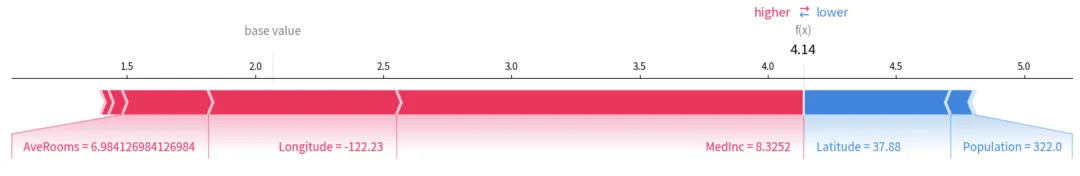 - Force Plot:解释单个样本。红色箭头代表将预测值推高的特征,蓝色代表推低的特征。