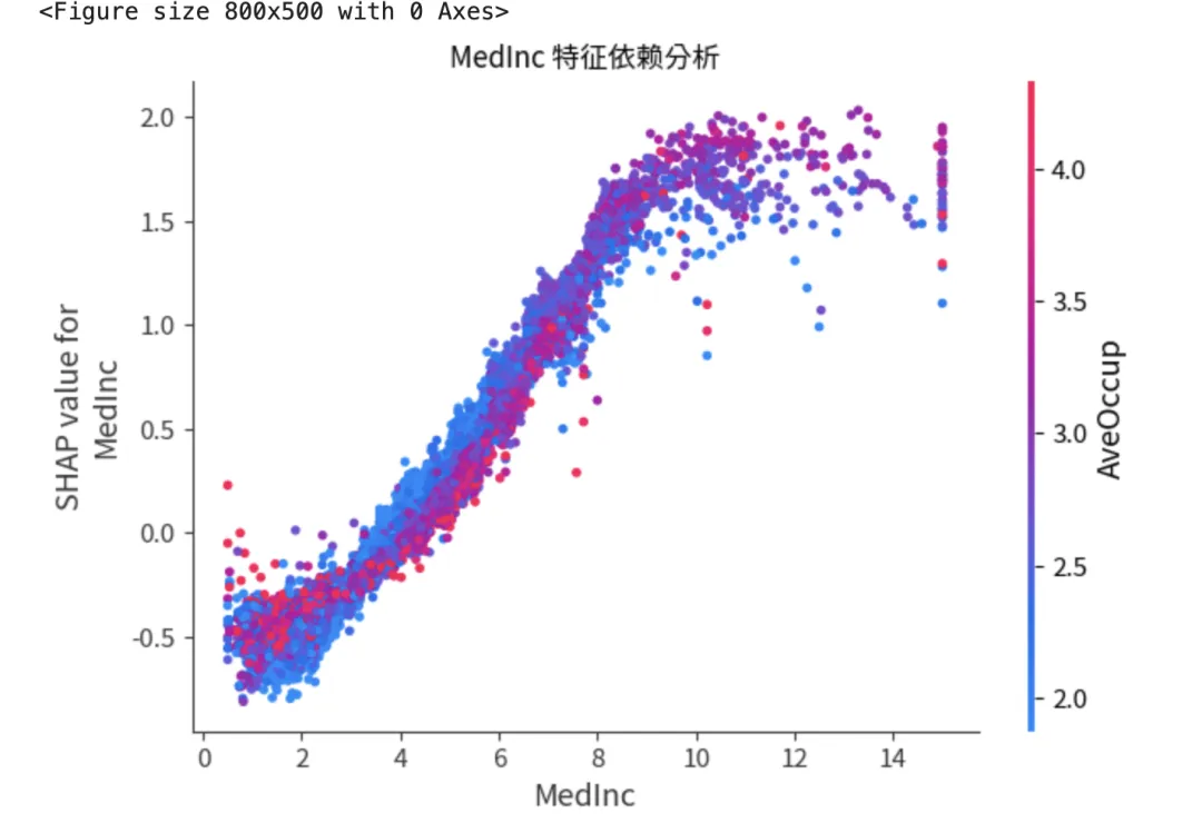 # C. 特征依赖图:Dependence Plot# 观察单个特征(如 'MedInc' 收入中位数)与预测值之间的非线性关系plt.figure(figsize=(8, 5))shap.dependence_plot("MedInc", shap_values, X, show=False)plt.title("MedInc 特征依赖分析")plt.show()
