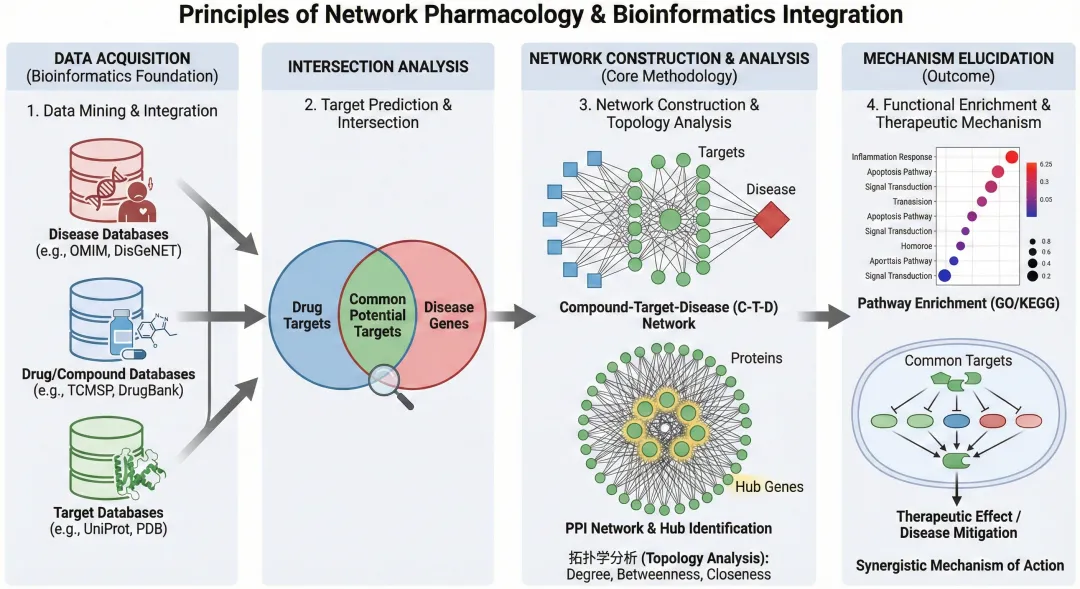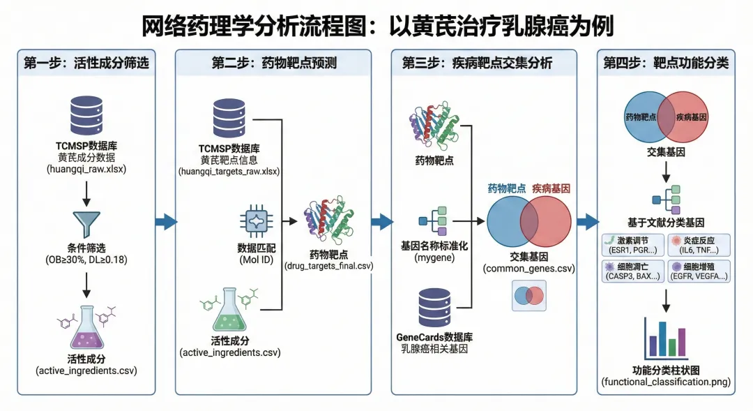 网络药理学作为中医药现代化研究的核心方法,已成为药物研发和机制研究的重要工具。2021年,国际期刊发布了网络药理学研究的标准化指南,标志着这一方法在学术界的广泛认可。然而,对于初学者而言,如何将理论转化为实践操作仍是一大挑战。本教程以黄芪治疗乳腺癌为案例,通过Python编程语言,完整呈现从成分筛选到靶点分析的全流程。您将掌握网络药理学的核心分析方法、Python在生物信息学中的实际应用,以及可复现的完整分析流程。无论您是医药研究人员、研究生,还是对中医药现代化感兴趣的学习者,这套零基础教程都能帮助您快速入门,开启系统生物学研究之路。传统中药研究长期面临着独特的挑战。一味中药往往包含数百种化学成分,每种成分又可能作用于多个靶点,这种复杂性使得用传统"单一化合物-单一靶点"的研究模式难以全面阐明中药的作用机制。以黄芪为例,现代植物化学研究已经从中分离鉴定出上百种化合物,包括黄酮类、皂苷类、多糖类等多种活性成分,这些成分通过不同途径共同发挥药理作用。正是在这样的背景下,网络药理学应运而生。这一方法借鉴系统生物学的思想,将药物、疾病、人体视为一个相互关联的整体网络,通过分析网络中的节点(基因、蛋白、代谢物)和连接(相互作用关系),揭示药物作用的整体规律。值得注意的是,这种"整体观"恰好与中医"辨证论治"的哲学思想不谋而合,为中医药理论的现代诠释提供了科学语言。近年来,网络药理学在学术界的影响力持续提升。从2007年概念提出至今,相关研究论文数量呈指数级增长。特别是在中医药领域,网络药理学已成为复方配伍研究、药效物质基础研究、作用机制研究的标准方法之一。网络药理学的核心在于"多成分-多靶点-多通路"的作用模式。传统西药研发遵循"一药一靶"原则,追求药物对单一靶点的高选择性。而中药的特点是多个活性成分协同作用,通过调控多个靶点,影响多条信号通路,最终产生整体治疗效果。这种作用方式更接近人体疾病发生发展的真实情况,因为大多数疾病本身就是多因素、多环节的复杂过程。从系统生物学视角来看,疾病是生物网络中某些节点或通路发生异常的结果,而药物的作用就是通过干预这些异常节点或通路,使网络重新达到平衡状态。网络药理学正是基于这一认识,通过构建"药物成分-作用靶点-疾病基因"的关联网络,识别出药物与疾病之间的共同作用节点,从而预测药物的治疗机制。与传统药理学相比,网络药理学具有明显的方法学优势。传统方法需要通过大量实验逐一验证每个成分的作用,耗时长、成本高。而网络药理学可以在实验前通过计算预测,筛选出最有可能的关键成分和靶点,为后续实验提供方向,大大提高研究效率。同时,网络分析还能发现单一实验难以观察到的成分间协同作用和靶点间的相互调控关系。一个完整的网络药理学研究通常包括以下几个关键步骤。首先是活性成分筛选,需要从中药的众多化学成分中,根据类药性质(如口服生物利用度、类药性指数等)筛选出可能发挥药效作用的成分。这一步骤至关重要,因为并非所有化学成分都能在体内达到有效浓度。其次是靶点预测与验证。对于筛选出的活性成分,通过数据库检索或分子对接等方法,预测它们可能作用的蛋白靶点。同时,从疾病相关数据库中获取疾病相关基因,两者取交集得到药物-疾病共同作用的关键靶点。然后是网络构建与分析。将成分、靶点、疾病基因等要素构建成可视化网络图,通过拓扑学分析识别网络中的关键节点,这些关键节点往往对应着药物发挥作用的核心靶点。最后是通路富集分析,将关键靶点映射到生物学通路数据库(如KEGG、GO等),阐明药物作用的具体生物学过程。整个流程体现了从宏观到微观、从预测到验证的研究思路,既保留了中医药整体观的特色,又符合现代医学对分子机制的认识要求。生物医学研究进入大数据时代,数据的规模和复杂度都达到了前所未有的水平。一个典型的网络药理学研究可能涉及数百个化合物、数千个基因、数万条相互作用关系。如果依靠人工处理,不仅效率极低,而且容易出错。这时候,编程工具的重要性就凸显出来。生物医学数据还有一个特点,就是来源多样、格式各异。研究者需要从TCMSP数据库获取中药成分信息,从GeneCards获取疾病基因,从STRING获取蛋白互作数据,从PubChem获取化合物结构,这些数据库的数据格式完全不同。手工整合这些数据既费时又容易遗漏信息,而编程可以实现自动化的数据抓取、转换和整合。更重要的是,网络药理学的核心在于数据分析和可视化。从原始数据到最终的韦恩图、网络图、通路图,中间需要进行大量的数据清洗、筛选、匹配、计算。这些重复性的工作用编程实现,不仅速度快,而且结果可重复、可验证,符合科学研究的严谨性要求。Python之所以成为生物信息学领域的首选语言,很大程度上得益于其丰富的科学计算库。在网络药理学研究中,几个核心工具库扮演着不可或缺的角色。Pandas是数据处理的基石。它提供了类似Excel表格的数据结构DataFrame,可以轻松实现数据的读取、筛选、合并、统计等操作。在本教程的案例中,从Excel文件读取成分数据、根据OB和DL值筛选活性成分、将药物靶点与疾病基因进行匹配,这些都是通过pandas完成的。pandas的强大之处在于,几行代