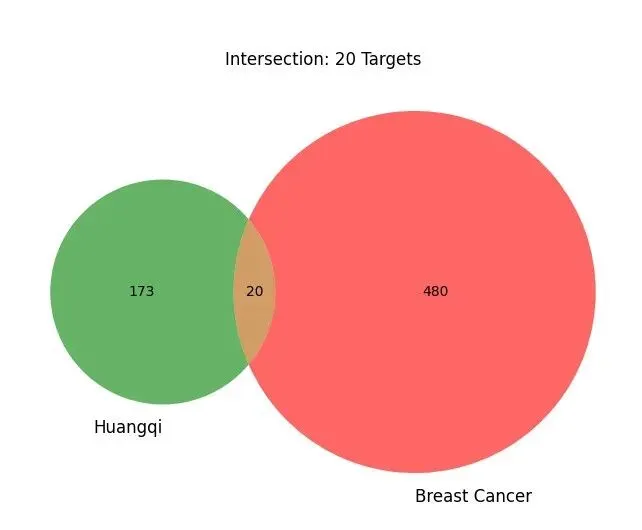 其次是了解数据来源。TCMSP是中药系统药理学数据库,提供了中药成分、靶点、疾病等信息,用户可以免费注册使用。GeneCards是人类基因数据库,收录了各种疾病相关基因及其功能注释。熟悉这些数据库的使用方法,能够帮助您更好地理解数据的含义。最后是文件管理。建议在电脑上新建一个专门的文件夹,将所有Excel数据文件和Python脚本放在同一个目录下。这样可以避免文件路径错误导致的程序运行失败。良好的文件组织习惯是科研工作的基本素养。黄芪是传统的补气中药,在《神农本草经》中被列为上品。现代药理学研究发现,黄芪具有免疫调节、抗氧化、抗肿瘤等多种生物活性。特别是在肿瘤治疗方面,黄芪多糖被证实能够增强机体免疫功能,黄芪甲苷可以诱导肿瘤细胞凋亡、抑制肿瘤血管生成。临床上,黄芪常与其他中药配伍用于癌症患者的辅助治疗,既能减轻化疗副作用,又能提高生活质量。乳腺癌是全球女性最常见的恶性肿瘤之一。尽管手术、放化疗等治疗手段不断进步,但复发转移仍是临床面临的难题。近年来研究发现,中医药在改善患者预后方面具有独特优势。本案例通过网络药理学方法,系统阐明黄芪治疗乳腺癌的潜在分子机制,为临床应用提供科学依据。网络药理学分析的第一步是从中药的众多成分中筛选出真正具有药效的活性成分。这一步骤的科学依据是ADME原则,即药物的吸收(Absorption)、分布(Distribution)、代谢(Metabolism)、排泄(Excretion)特性。一个化合物即使在体外实验中显示出很强的生物活性,如果不能被人体吸收或迅速代谢排出,也无法发挥治疗作用。在实际操作中,我们采用两个关键指标进行筛选。第一个是口服生物利用度,用OB值表示,反映药物经口服给药后进入血液循环的比例。一般认为OB值大于等于30%的化合物具有较好的口服吸收性。第二个是类药性指数,用DL值表示,综合评价化合物在分子量、脂溶性、氢键等方面是否符合药物特征。通常DL值大于等于0.18被认为具有类药性质。具体的操作流程是这样的:首先从TCMSP数据库下载黄芪的全部化学成分信息,保存为Excel文件,命名为huangqi_raw.xlsx。这个文件包含了成分的中英文名称、分子式、OB值、DL值等详细信息。然后使用Python脚本对数据进行筛选。第一步是读取Excel文件,这里使用pandas库的read_excel函数。需要注意的是,有些Excel文件可能需要指定openpyxl引擎才能正确读取。第二步是清理列名,因为从数据库下载的数据表头可能包含空格或换行符,需要用字符串处理方法去除这些干扰字符。第三步是智能查找OB和DL列。不同来源的数据,列名可能略有差异,比如有的叫"OB (%)",有的叫"OB"。代码通过遍历所有列名,找到包含"OB"和"DL"关键词的列,实现了一定的智能性,避免了因列名不完全一致导致的错误。第四步是数据类型转换和空值处理。OB和DL的原始数据可能是字符串格式,需要转换为数值才能进行比较运算。同时,有些成分可能缺少OB或DL数据,这些记录应该删除,否则会影响后续分析。最后一步是条件筛选,使用pandas的布尔索引功能,选出同时满足OB大于等于30且DL大于等于0.18的记录,保存到新的CSV文件中。运行这个脚本后,程序会在屏幕上显示筛选结果,比如"筛选完成!获得活性成分:20个"。打开生成的active_ingredients.csv文件,可以看到筛选后的成分列表。这些成分就是我们认为可能具有抗乳腺癌活性的黄芪有效成分,为下一步的靶点分析奠定了基础。确定了活性成分之后,接下来要解决的问题是:这些成分作用于人体的哪些蛋白靶点?这就是靶点预测的任务。在传统药理学研究中,确定一个化合物的作用靶点需要大量的体外实验和体内验证。而网络药理学可以利用现有的数据库资源,快速预测可能的作用靶点。TCMSP数据库不仅包含中药成分的理化性质,还整合了成分-靶点的作用关系。这些关系大多来源于已发表的文献和高通量筛选实验。每个成分都有一个唯一的Mol ID作为标识符,通过这个ID可以关联到对应的靶点信息。首先准备两个输入文件,一个是上一步生成的activeingredients.csv,包含筛选后的活性成分及其Mol ID;另一个是从TCMSP下载的黄芪靶点信息表huangqitargets_raw.xlsx,包含了所有成分对应的靶点蛋白名称。代码的关键在于数据匹配。两个表都包含Mol ID这一列,但列名可能不完全一致。代码首先定义了一个智能查找函数,自动识别包含"MOL"和"ID"关键词的列,然后将两个表中的对应列统一重命名为"Mol ID"。这样做的好处是增强代码的通用性,即使数据来源稍有变化,代码仍能正常运行。接下来使用pandas的merge函数进行表连接。这个操作类似于Excel中的VLOOKUP或数据库中的JOIN操作,根据Mol ID将两个表关联起来。连接方式选择inner,意思是只保留两个表中都存在的Mol ID,这样就筛选出了活性成分对应的靶点。最后从合并后的表中提取靶点名称列。TCMSP中靶点名称列通常叫做"Target Name",包含了靶点蛋白的全称。代码通过智能查找包含"TARGET"和"NAME"关键词的列,提取出所有不重复的靶点名称,保存到drugtargetsfinal.csv文件中。运行结果会显示"匹配完成!获得药物靶点:50个"(具体数字取决于实际数据)。这50个靶点就是黄芪活性成分可能作用的蛋白质,它们涵盖了激素受体、酶、离子通道、转录因子等多种类型。这一步的输出为后续的疾病基因交集分析提供了药物侧的数据。有了药物靶点,还需要疾病靶点,