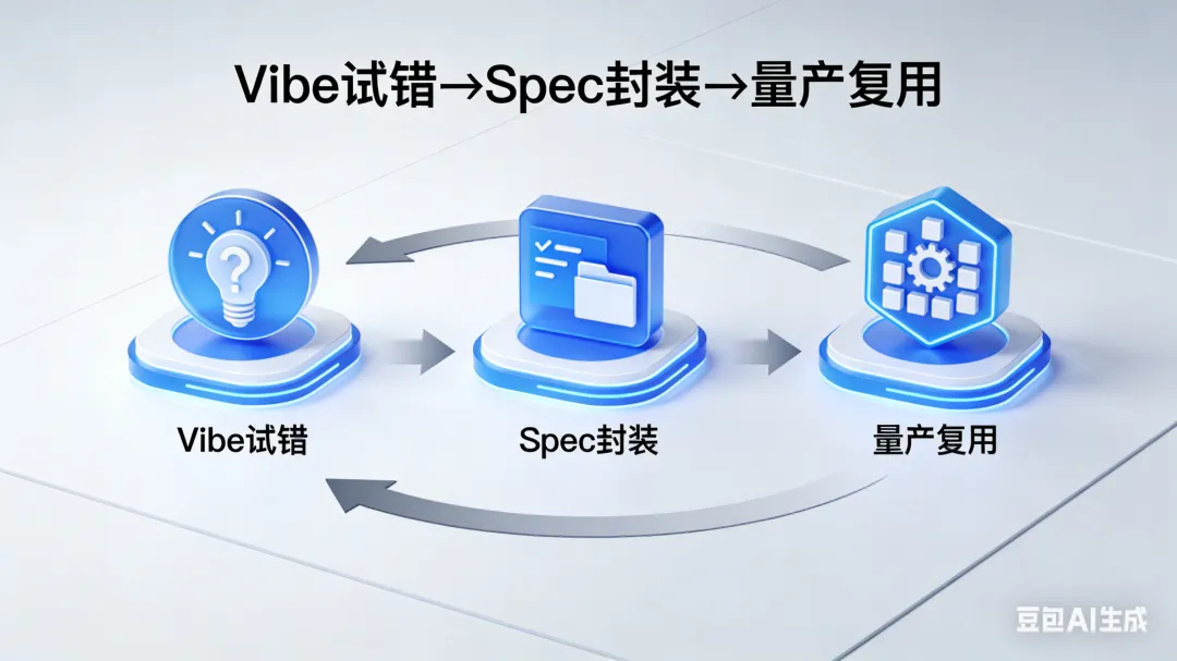 光有模板还不够,还要把“Vibe试错→Spec封装→量产复用”的流程固化下来,简单来说就是四步: