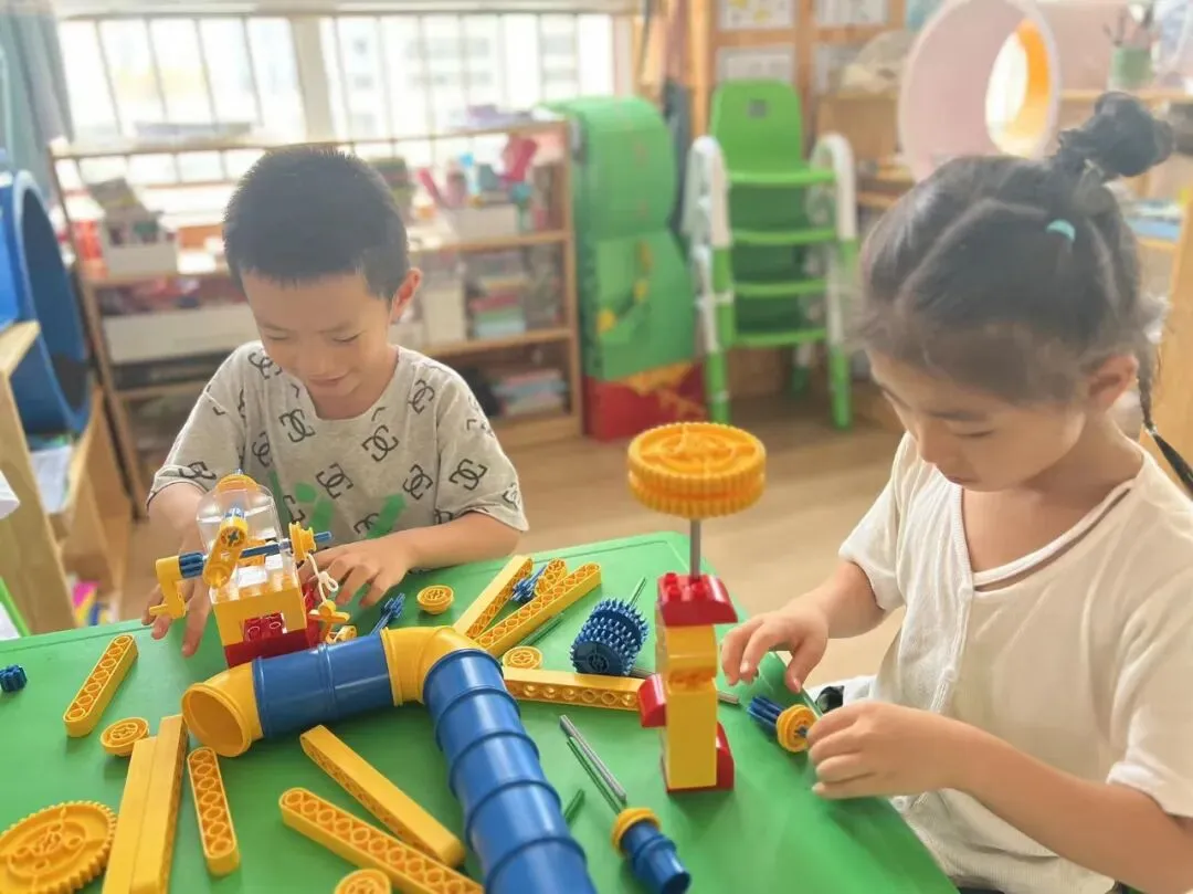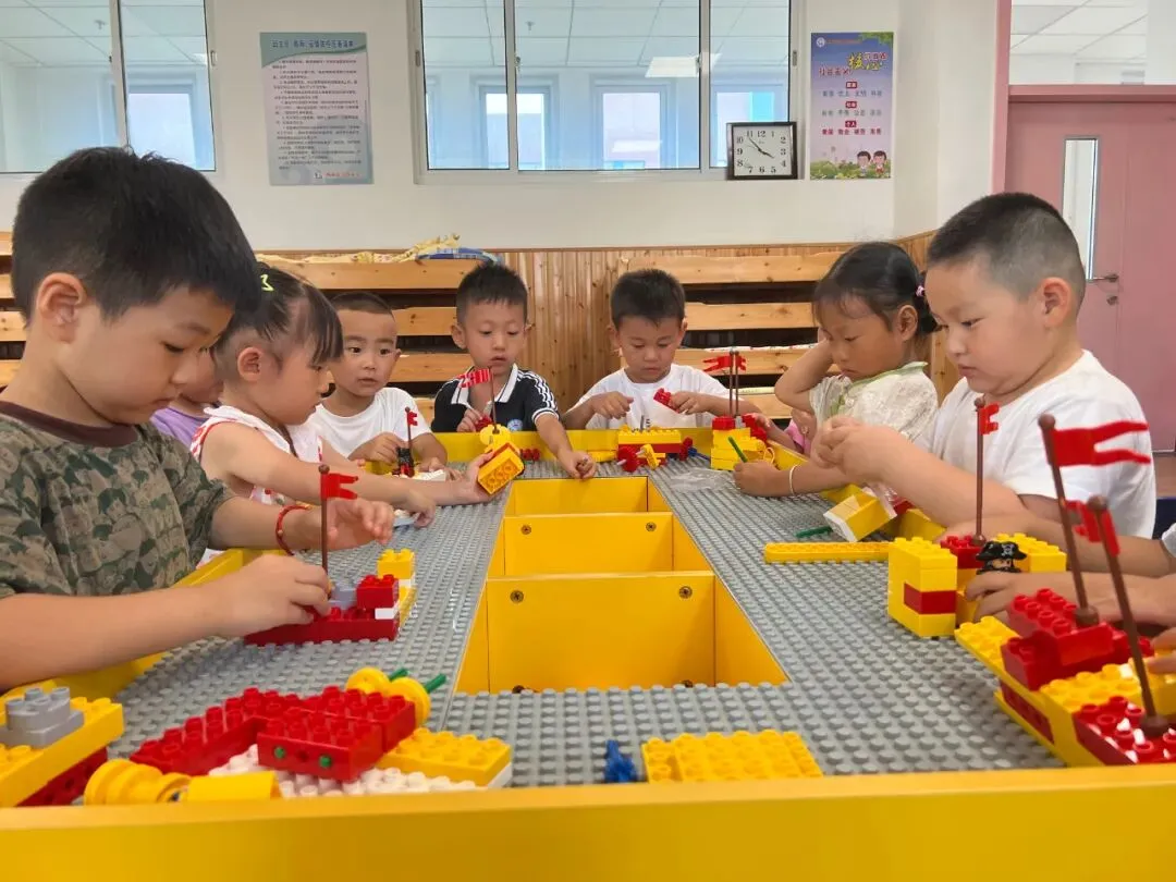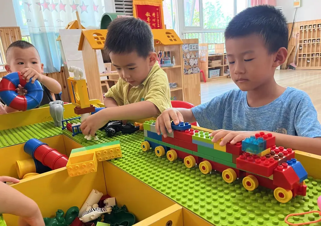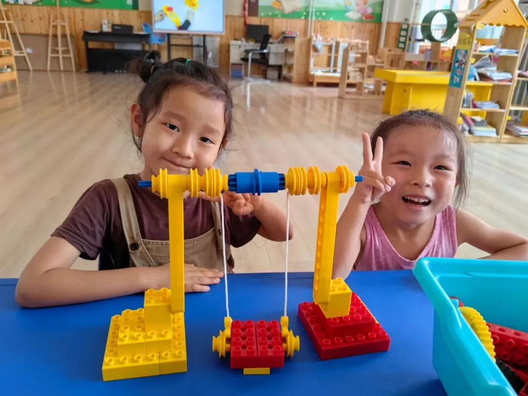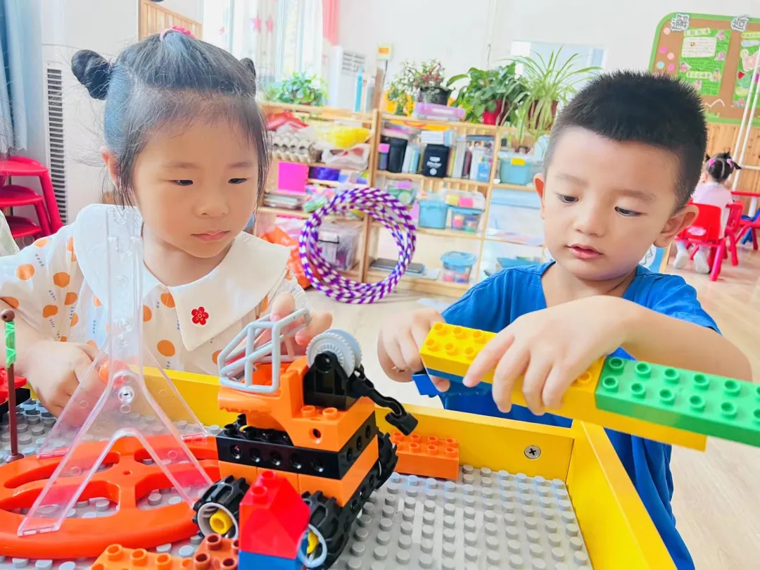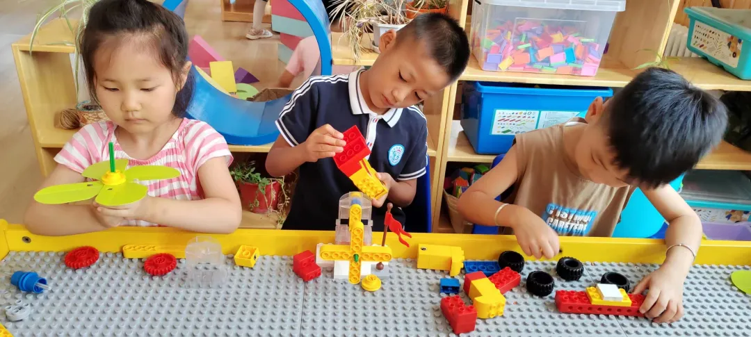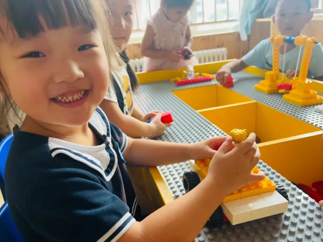 为了满足不同年龄段孩子发展的需要,老师们对乐高玩具进行了分层、分阶段投放。孩子们在活动中自由主动,思绪翻飞,小小的积木变换出各式各样的造型。