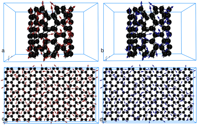 图1. 通过自动微分、GULP和LAMMPS计算的力对比图。(a) 红色箭头表示通过自动微分计算得到的力;(b) 蓝色箭头表示通过我们为碳纳米管实现的GULP代码计算的力;(c) 红色箭头表示通过自动微分计算得到的力;(d) 蓝色箭头表示通过我们为石墨烯片实现的LAMMPS代码计算的力。