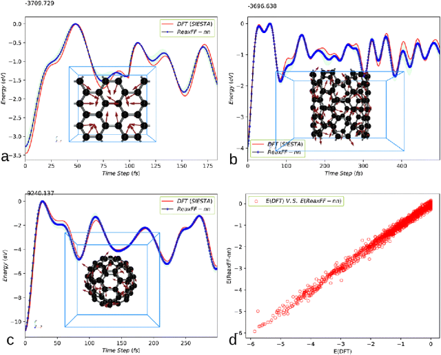 图2. DFT数据与ReaxFF-nn预测结果的对比图。DFT-MD数据通过SIESTA软件采集,采用PBE泛函和双ζ极化基组。图中分别展示了(a)石墨烯、(b) 6×6碳纳米管和(c)富勒烯(C₆₀)的对比结果。(d) 展示了ReaxFF-nn对所有训练数据的能量误差评估指标。