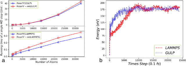 图3. (a) 单个MD步长的耗时对比:ReaxFF-nn与基于GULP包(上图)和LAMMPS包(下图)的ReaxFF在不同原子数下的计算时间对比。(b) 在长达2.5 ps的分子动力学模拟中,使用GULP和LAMMPS包模拟10 × 10 × 10石墨烯片层势能随时间的变化情况。图4. 二维石墨烯晶格层声子色散关系的对比:GAP-20、DeePMD与ReaxFF-nn势函数的计算结果。声子色散关系通过Phonopy软件包计算得出。