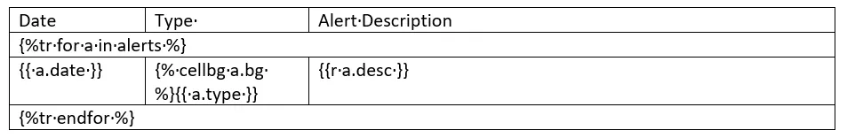 # python-docx-template/blob/master/tests/comments.pyfrom docxtpl import DocxTemplate, RichText# data: python-docx-template/blob/master/tests/templates/cellbg_tpl.docxtpl = DocxTemplate("templates/cellbg_tpl.docx")context = {"alerts": [ {"date": "2015-03-10","desc": RichText("Very critical alert", color="FF0000", bold=True),"type": "CRITICAL","bg": "FF0000", }, {"date": "2015-03-11","desc": RichText("Just a warning"),"type": "WARNING","bg": "FFDD00", } ],}tpl.render(context)tpl.save("output/cellbg.docx")本示例主要介绍通过自定义Jinja2过滤器实现动态数据渲染,Jinja2模板中过滤器的核心格式为:{{ 变量名|过滤器名(参数1, 参数2, ...) }},其中: