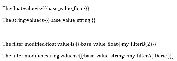 |(竖线)是过滤器的分隔符,左侧是要处理的变量,右侧是过滤器名称;()内是传给过滤器函数的参数(无参数时可省略括号);{{ base_value_float|my_filterB(2) }} 中,base_value_float是变量,my_filterB是过滤器名,2是传递的参数。模板内容: