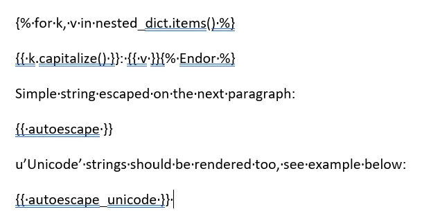 # python-docx-template/blob/master/tests/escape_auto.pyimport osfrom unicodedata import namefrom docxtpl import DocxTemplateXML_RESERVED = """<"&'>"""# data: python-docx-template/blob/master/tests/templates/escape_tpl_auto.docxtpl = DocxTemplate("templates/escape_tpl_auto.docx")context = {"nested_dict": {name(str(c)): c for c in XML_RESERVED},"autoescape": 'Escaped "str & ing"!',"autoescape_unicode": "This is an escaped <unicode> example \u4f60 & \u6211","iteritems": lambda x: x.items(),}# autoescape=True表示自动转义tpl.render(context, autoescape=True)OUTPUT = "output"ifnot os.path.exists(OUTPUT): os.makedirs(OUTPUT)tpl.save(OUTPUT + "/escape_auto.docx")实际上iteritems(nested_dict)就是调用渲染定义的lambda函数,把nested_dict传进去,拿到它的所有键值对: