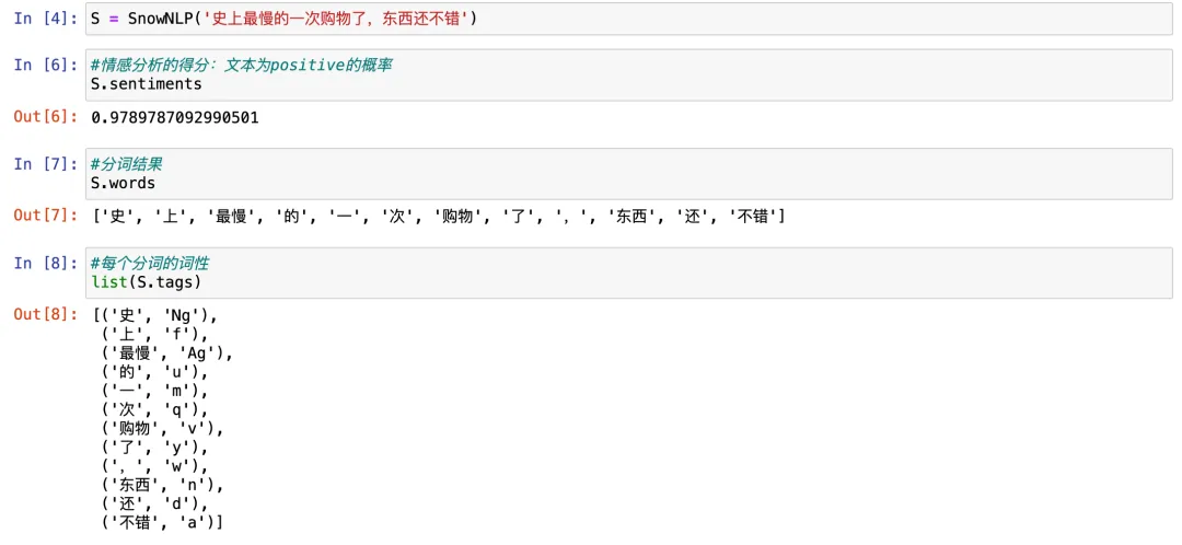 的Python库,其设计哲学是"快速、简单、够用"。与NLTK、spaCy等通用NLP库不同,SnowNLP专为中文优化,内置了中文特有的处理逻辑。