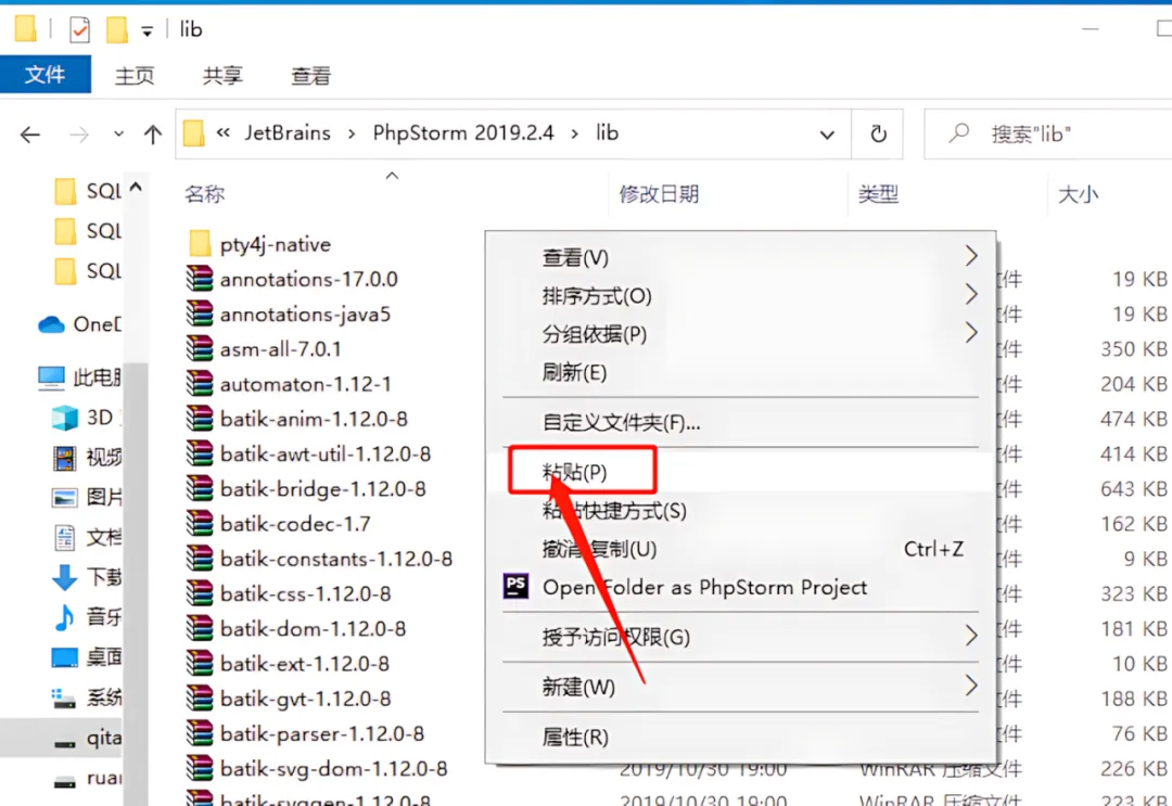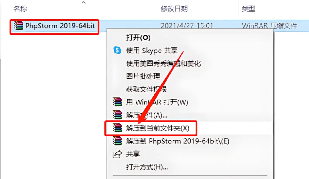 1.鼠标右击【PhpStorm 2019 64bit】压缩包,点击【解压到当前文件夹】。