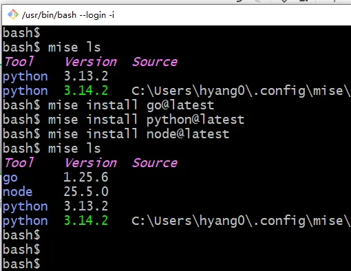 近两天短视频上在推这款工具,我测试了一下。工具使用效果如下:测试发现使用 mise 下载各种编程语言速度挺快的,并且不需要开代理。 mise 可以用来管理不同版本的编程语言,可以通过@下载指定版本,也可以直接使用 @latest 下载最新版本。mise exec python -- python --version