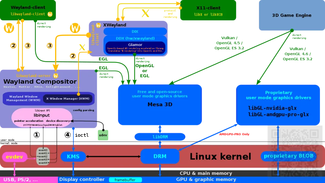 - 1. 3D游戏引擎,直接基于相关的OpenGL接口进行开发,完成图形图像相关的处理。事件处理其实还是基于libinput。