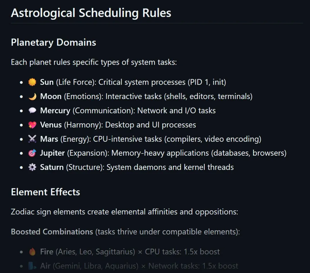 援引博文介绍,该调度器完全依据占星术原则来管理计算机资源,通过实时读取行星位置、星座以及元素属性(如火象、水象),以此决定 CPU、网络及内存任务的优先级。