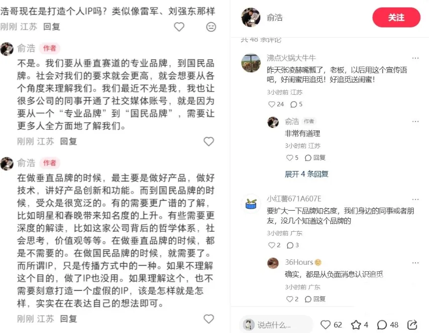 有网友询问俞浩“现在是打造个人 IP 吗?类似像雷军、刘强东那样”,俞浩表示: