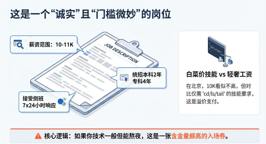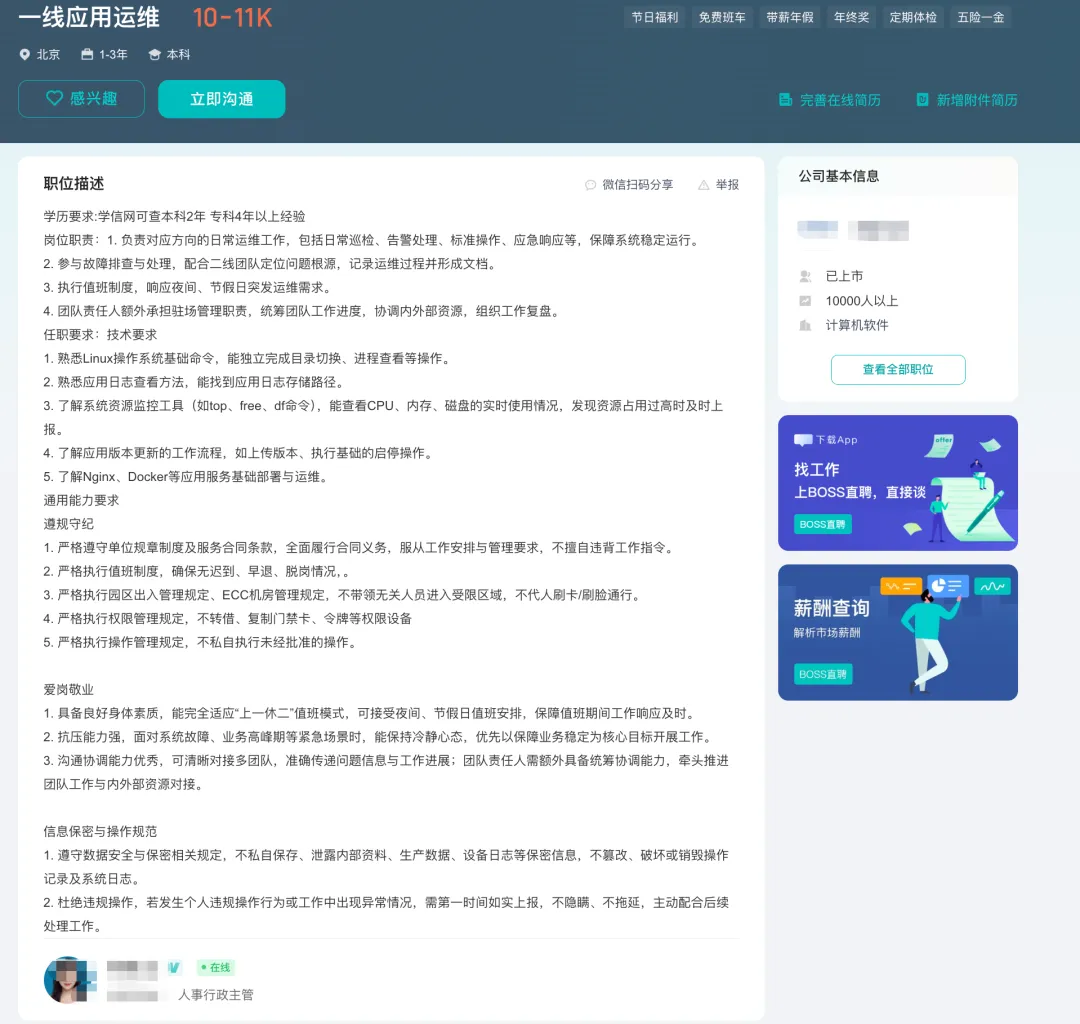 看到“10-11K”在北京,很多人可能会觉得低。但如果你仔细看技能要求:会Linux基础命令、能看懂日志、能接受倒班。 这就好比拿着“白菜价”的技能,却给了“轻奢”的工资。为什么?因为这多出来的钱,买的是你的“情绪稳定”和“生物钟”。 今天小源就带你扒一扒这个“一线应用运维”的里子。