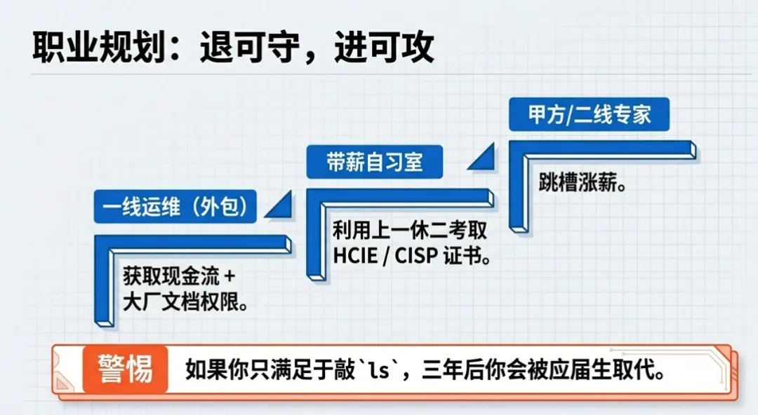 适合谁:学历大专、非计算机科班转行、或者目前处于职业空窗期急需现金流的朋友。利:门槛低,进入大厂生态圈(虽然是外包),上一休二虽然累但自由时间多,适合考公、考研或考证(HCIE/CISP)。弊:技术天花板极低。如果你只满足于敲 ls 和 top,三年后你会被毕业生卷死。下一步:把它当做“带薪自习室”。拿下Offer,利用大厂的文档库学习真正的架构,利用休息时间考下含金量高的证书,为跳槽甲方做准备。