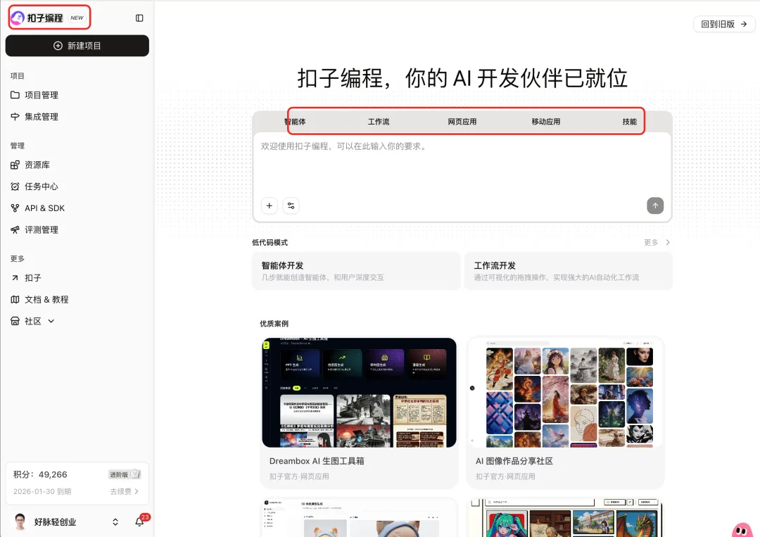- • 注册并登录Coze账号,进入“扣子编程”模块,即可启动开发。